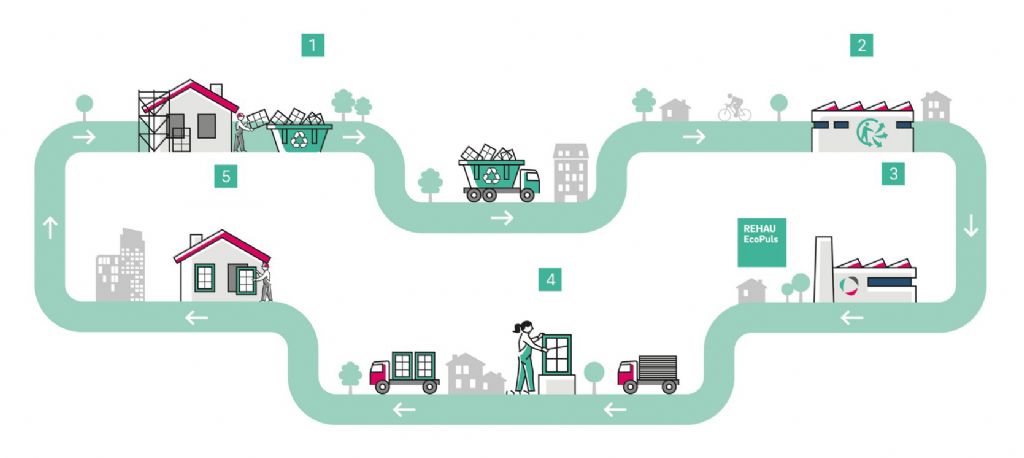 Miljoenen oude pvc-ramen zijn een waardevolle bron voor nieuwe kunststoframen. REHAU beschikt over een heel groot netwerk om dit materiaal in te zamelen. Complete oude ramen worden in verschillende grondstoffen (bv. glas en metaal) opgesplitst en gerecycled.