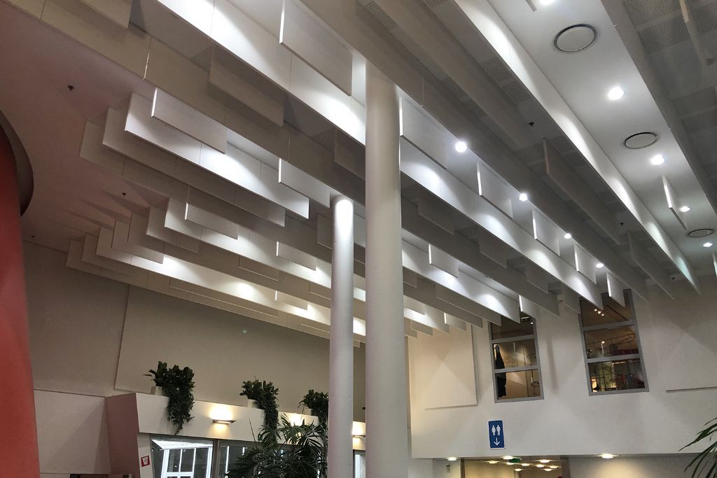 De inkomhal van Technopolis is vrij hoog en de uitdaging was om de baffles op deze hoogte zo strak mogelijk te installeren. Aangezien het doel was om de wandpanelen zo onopvallend mogelijk te plaatsen, koos Renobo voor dezelfde kleur als de muren. Op die manier bleef het bestaande interieur behouden.