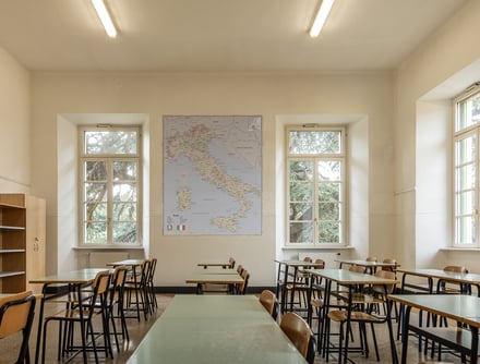 Het is een koude ochtend in januari. Terwijl de natuur nog in winterslaap is, is er al veel bedrijvigheid in het Collegio della Guastalla. Ouders brengen hun kleintjes naar het dagverblijf. Kinderen en jongeren druppelen het gebouw binnen, bespreken hun huiswerk – of laten elkaar de nieuwste hoogtepunten op Instagram zien. Leraren beëindigen hun ochtendgesprek met een collega en gaan op weg naar het klaslokaal. Langzaamaan komt iedereen in de juiste ruimte terecht. De schooldag begint hier zoals overal – met één verschil, waar de meeste leden van de schoolfamilie zich waarschijnlijk niet eens bewust van zijn: ze bevinden zich in een gebouw dat meer dan 150 jaar oud is, maar met gloednieuwe ramen.
