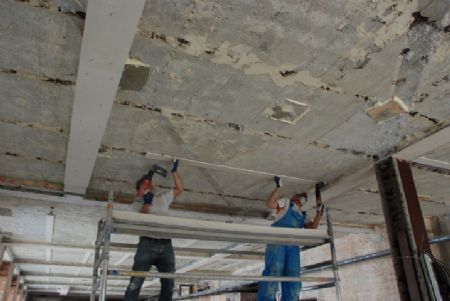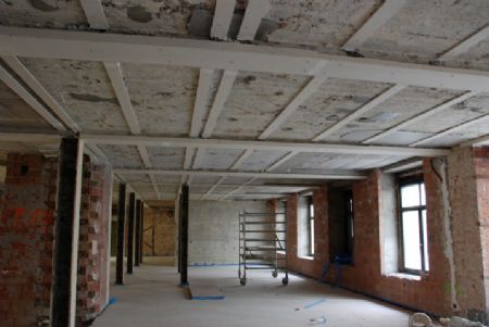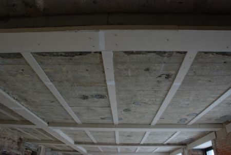 De stalen liggers van de draagvloeren die geheel of gedeeltelijk in het beton zijn ingestort, worden onderaan beschermd met een strook PROMATECT®-H van 15 millimeter.