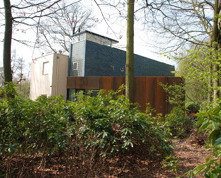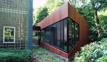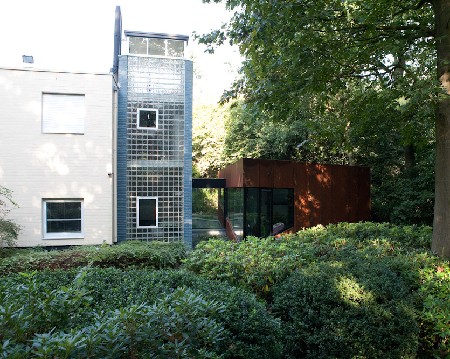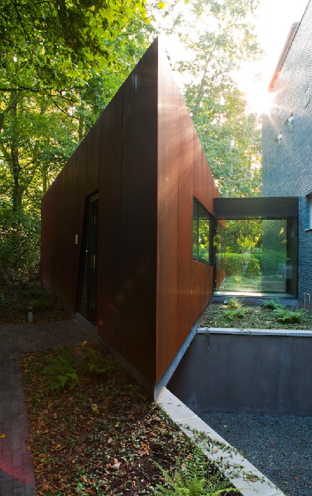 Vanaf het begin was het uitgangspunt: de villa ongemoeid laten en enkel herstellingswerken uitvoeren waar nodig. De praktijkruimte werd in een nieuw, driehoekig volume ondergebracht, dat los staat van de bestaande woning. De twee zijn enkel verbonden via een glazen gang, zodat de villa visueel haar autonomie behoudt. De uitbreiding is volledig bekleed met Cortenstaal om via een ander materiaal aansluiting te zoeken met de bestaande woning, maar tegelijk het nieuwe gedeelte zijn eigenheid te geven.