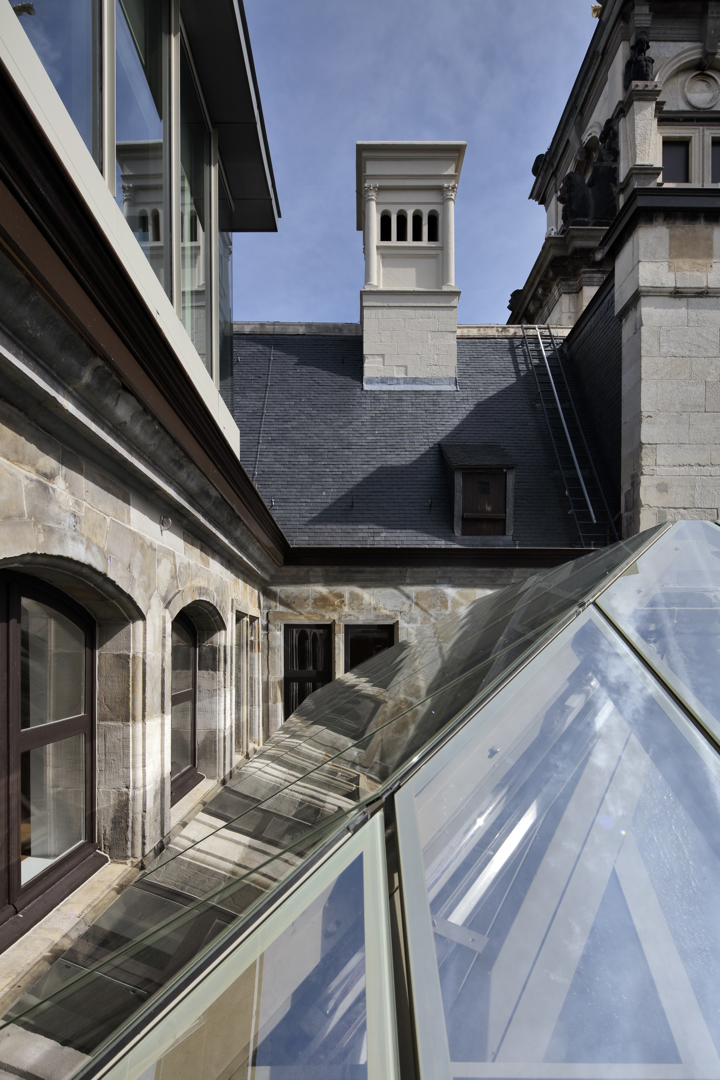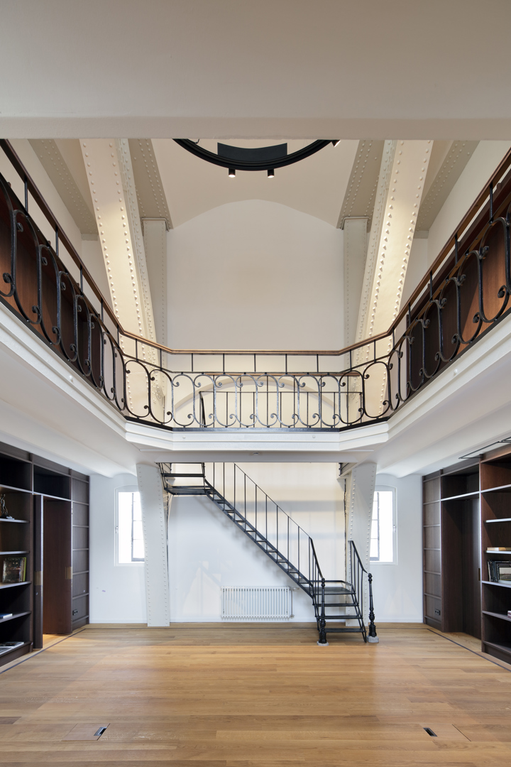 Origin-HUB slaagde erin om historische grandeur — zoals het “Schoon Verdiep” met zijn goudleer en muurschilderingen — te combineren met innovatieve ingrepen zoals discrete stalen structuren en een glazen lichtkoepel die hedendaagse kunst en daglicht tot in de kern van het gebouw brengt.
