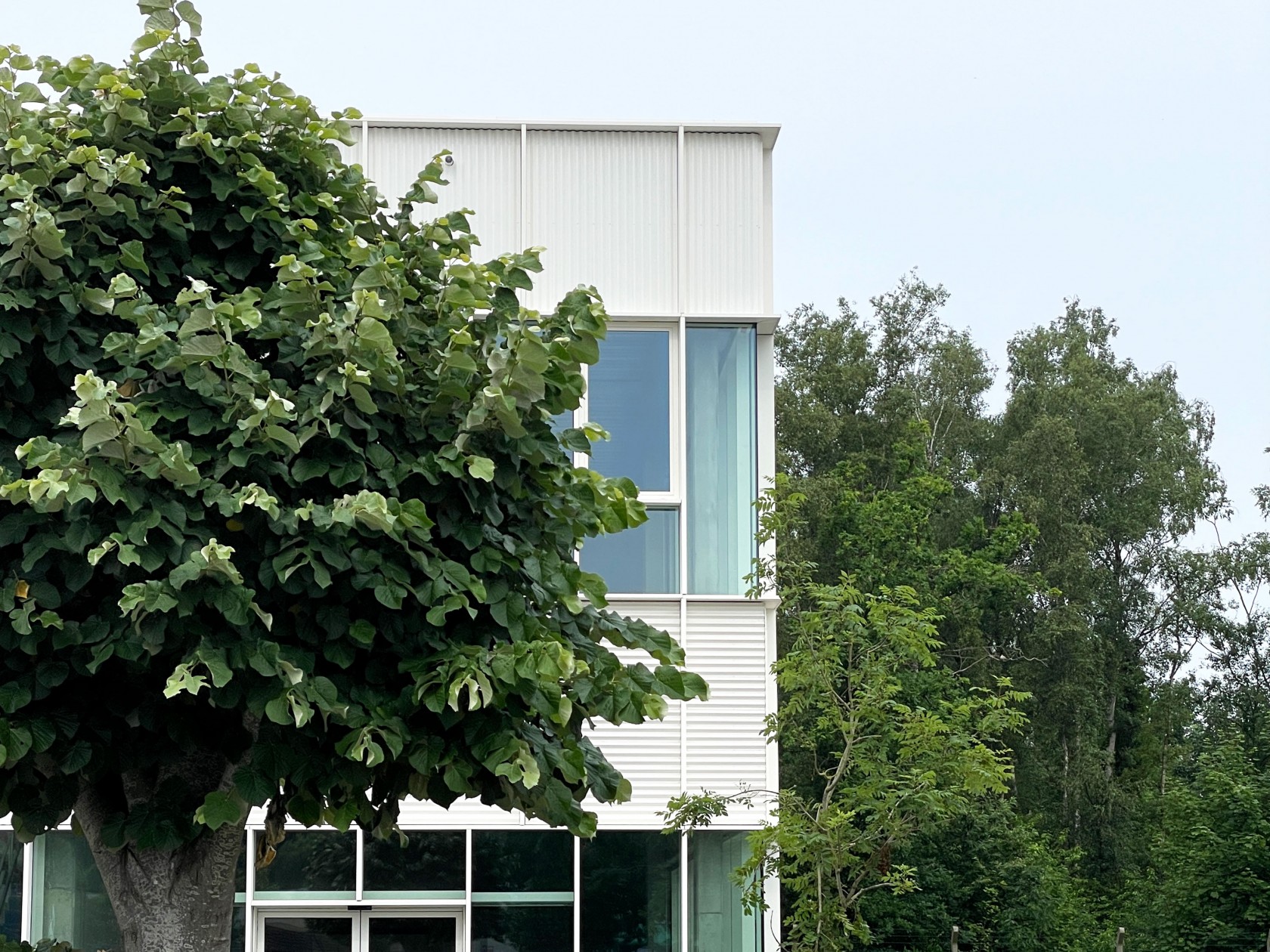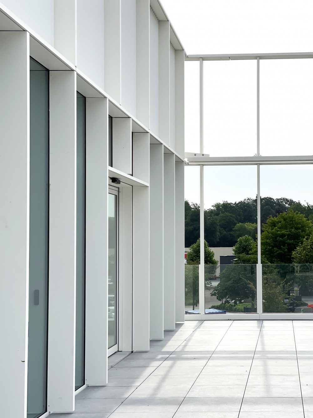 Op niveau +1 sluit de unit aan op een ruim terras. Hier loopt het aluminium raster van de gevel ongestoord door, dit keer ingevuld met glazen borstwering. De ononderbroken repetitie van het frame zorgt voor een continuïteit in de gevel, dit versterkt het eenheidsgevoel.