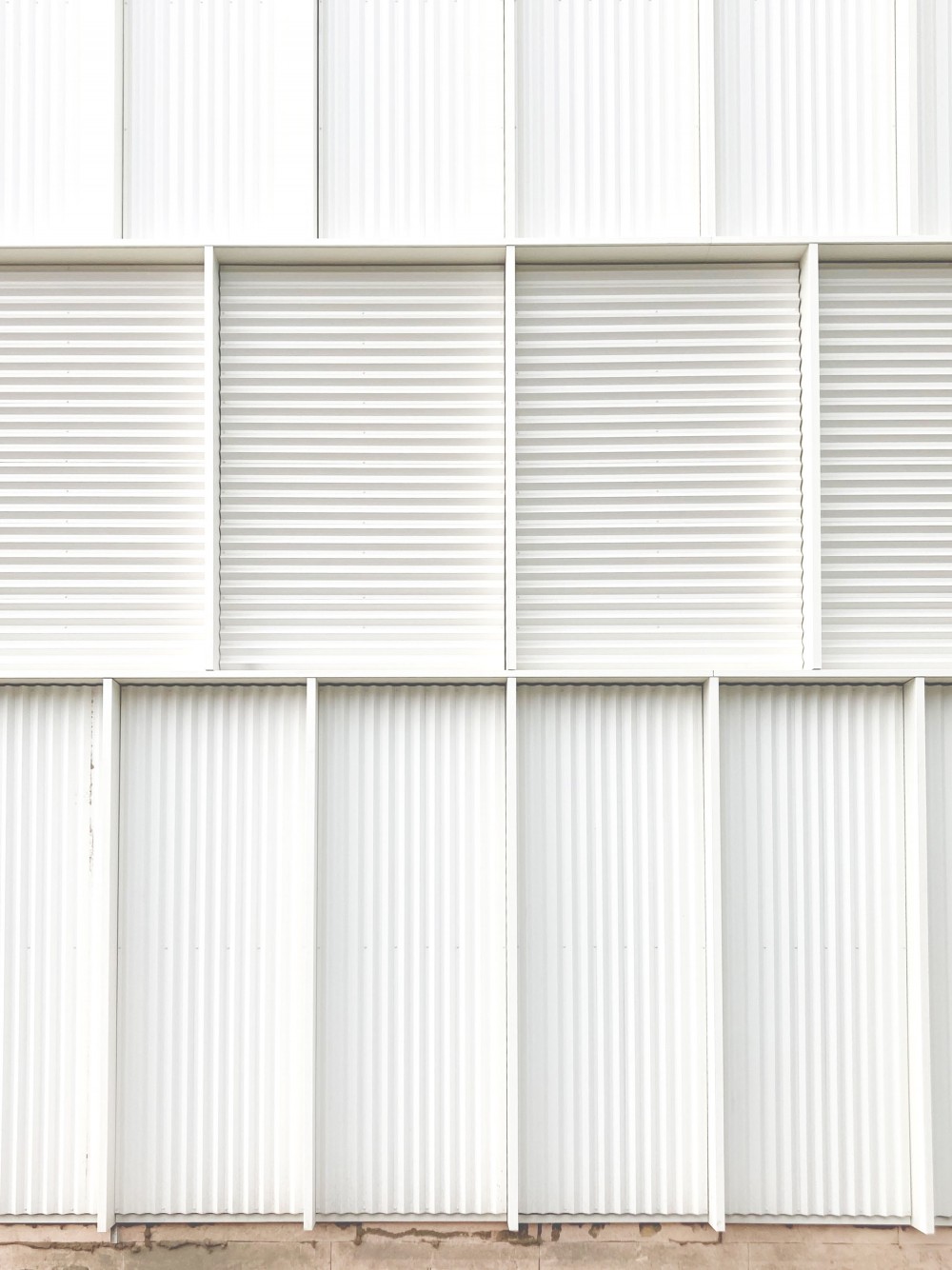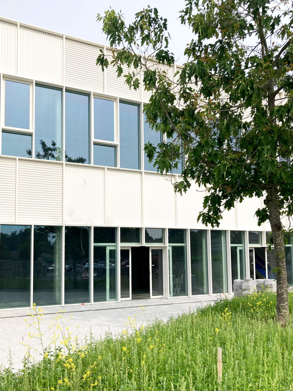 De gevels werden bekleed met een met een continue frame in aluminium met een vaste module. Dit frame wordt – afhankelijk van de achterliggende functies – anders ingevuld. Transluscent, transparant en gesloten wisselen elkaar af. De geprofileerde staalplaten worden alternerend verticaal en horizontaal geplaatst zodat er ten gevolge van de schaduwwerking dynamiek in de gevel ontstaat.