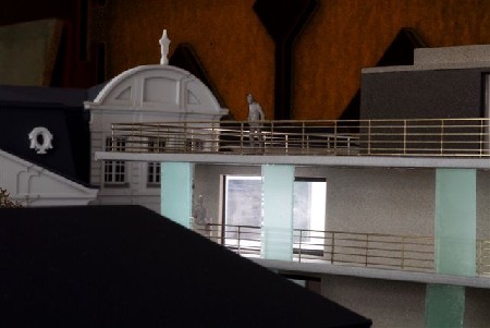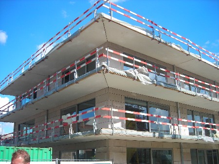 Architecturaal wordt het geheel van de nieuwbouw vertaald als een massief volume in keramische gevelbekleding van 16 m diep met diverse inpandige terrassen aan de straatzijde. Er wordt hierbij gestreefd naar een “terrasarchitectuur” van betonnen terrassen en lijnelementen van 18 meter diep welke geanimeerd wordt door schuifpanelen. Deze schuifpanelen zouden aanvankelijk uitgevoerd worden in gezuurde beglazing, maar omwille van het opwarmingseffect die deze zouden veroorzaken werd later beslist om het glas te vervangen door lichtbruine textielen.