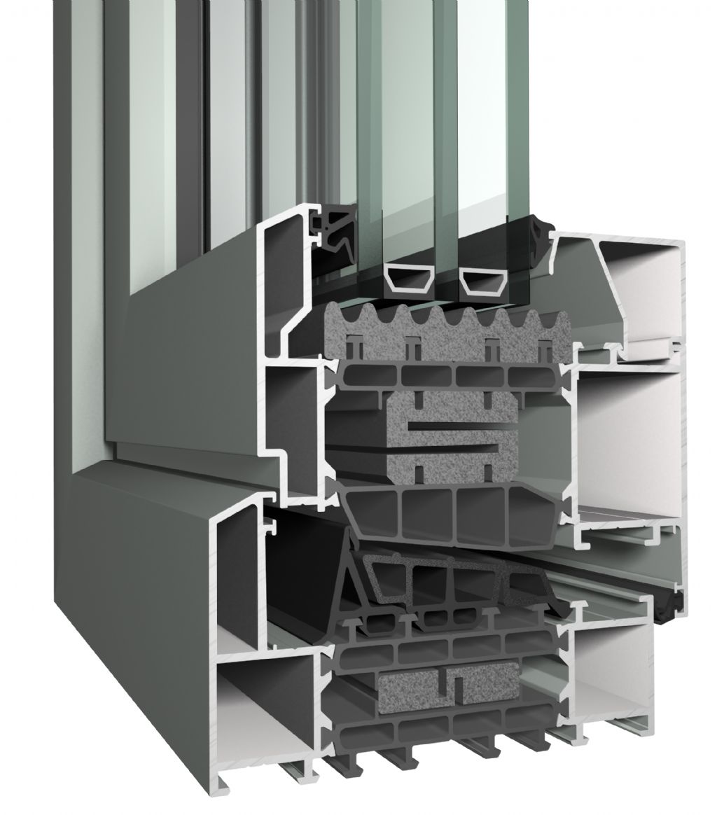 Het hoog isolerende karakter wordt bekomen door de integratie van nieuwe innovatieve materialen en de opbouw van de thermische onderbreking. Kader-vleugel combinaties halen Uf waardes onder 1.0 W/m²K en op profielniveau dalen deze verder tot minimum 0.76 W/m²K.