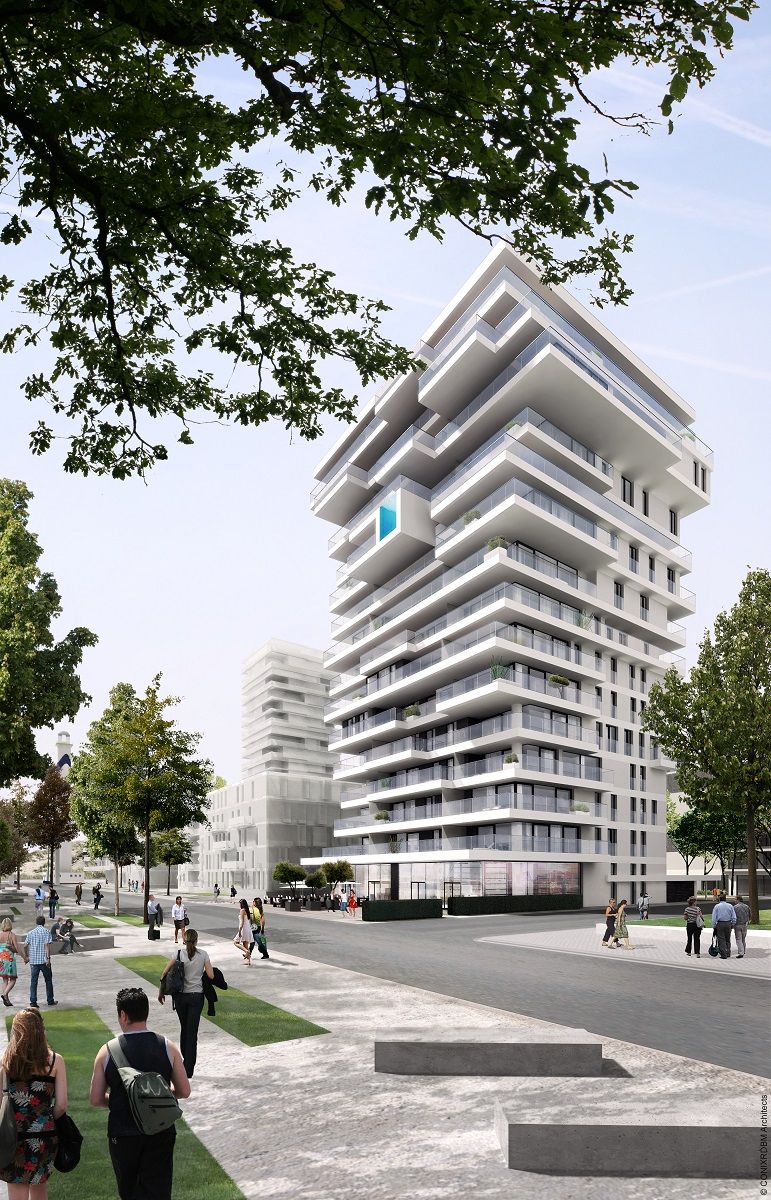 Het gebruik van nagespannen vloerplaten geeft een maximale vrijheid in de indeling van de appartementen. Het grootste appartement, op de topverdieping, krijgt een terras van 173 m²met ingeklemde glazen borstwering. “Omdat er in de omgeving geen andere hoogbouw staat, wordt dit gebouw een echt landmark,” voorspelt Leyssens. “Het krijgt ook een erg luxueus karakter.” Daarmee verwijst hij niet alleen naar het panoramisch uitzicht en de esthetiek, zoals de gevelafwerking in wit gepolierd architectonisch beton of de houten terrasvloeren. “Twee appartementen, op de elfde en de veertiende verdieping, zullen beschikking over een eigen zwembad. Het grootste krijgt een lengte van 7,7 meter. Beide zwembaden worden voorzien van een glazen zijwand die 15 centimeter dik én onbreekbaar is.”