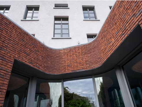 De gekozen gevelsteen contrasteert sterk met de achtergevel van het hoofdgebouw maar verwijst wel naar de omliggende bebouwde omgeving.