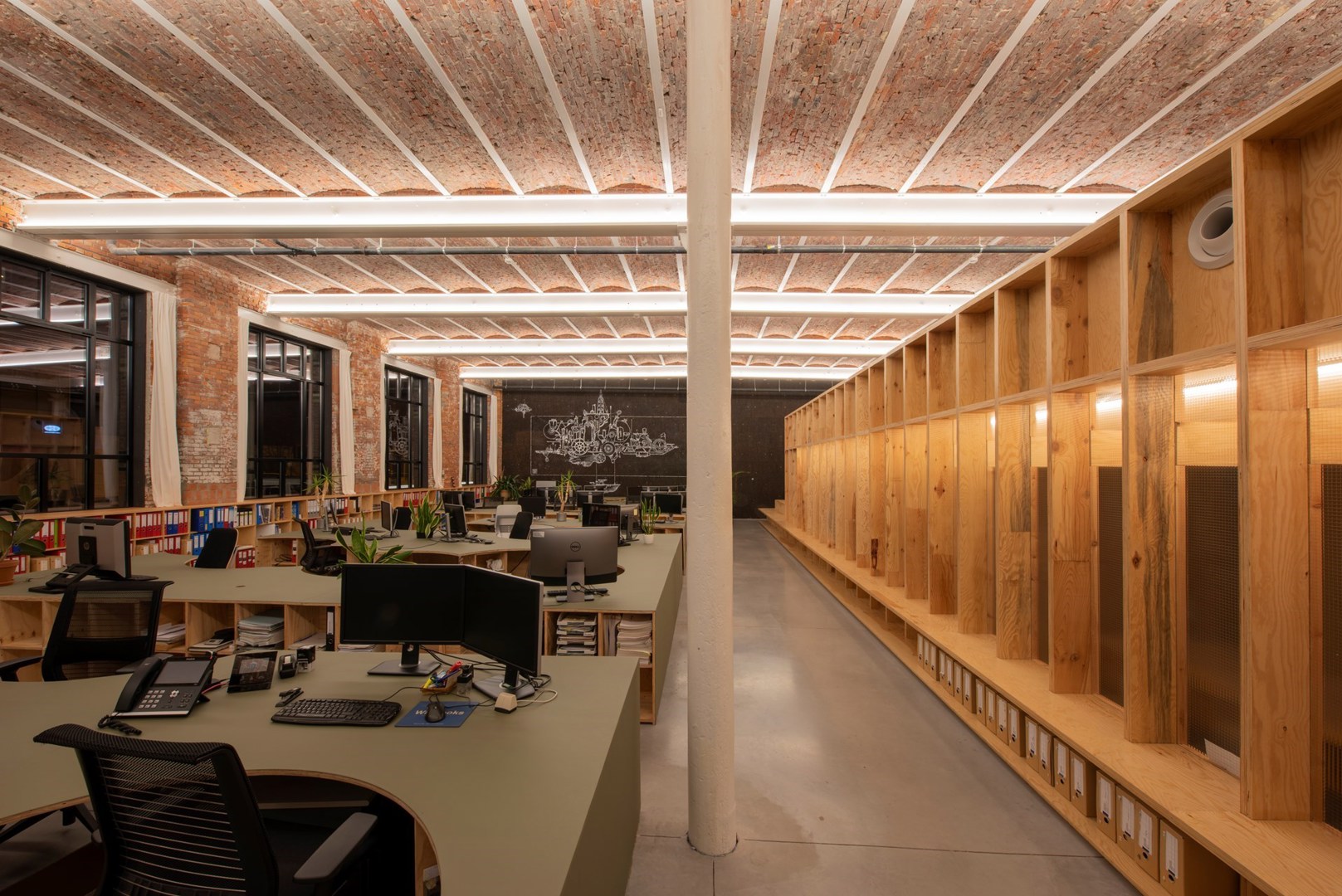Hoewel het door de verborgen bevestigingen misschien niet zo lijkt, ontwierp ROBUUST het houten volume helemaal demonteerbaar zodat het ooit elders opnieuw kan worden ingezet. Om zo weinig mogelijk afval re creëren, werd de constructie ontworpen op de maat van de gebruikte multiplexplaten en met LVL-balken volgens een repetitief schema. Daartussen werd glas geplaatst dat verstevigd werd met een CLS-lat. Richting de archiefgang is het glas klaar, maar aan de kant van het kantoor is het gewapend, om het zicht te bufferen, maar ook omdat die look mooi aansluit bij het industriële karakter van het gebouw. Het houten volume werd volledig geprefabriceerd en op slechts een dag geplaatst.