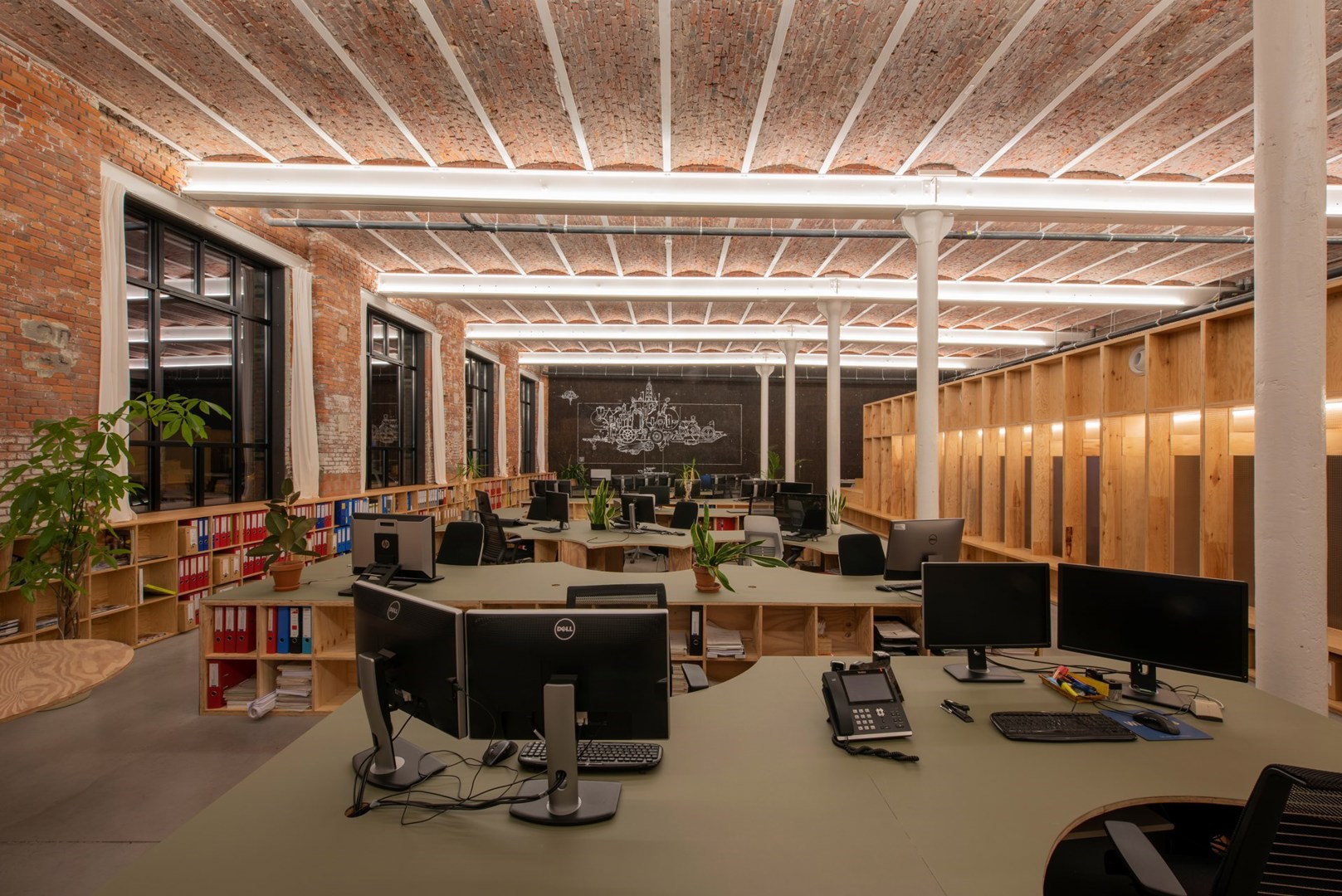ROBUUST achitectuur & onderzoek, dat zijn kantoor midden in de Gentse haven ontgroeid was en al een tijdje op zoek was naar een bestaande nieuwe locatie – het wilde absoluut geen nieuw gebouw realiseren –, twijfelde geen minuut toen de ruimtes in de commerciële plint in de verkoop gingen. Het kocht, getriggerd door de architecturale waarde en rijke historie van het gebouw, twee van de vier units om er een nieuwe thuisbasis voor zichzelf en zusterfirma signum+ architects van te maken. Om de troeven van het gebouw die hen zo aanspraken te respecteren, maar ook vanuit zijn integrale visie op duurzaamheid, besloot ROBUUST zo weinig mogelijk interventies te doen. De enige echt structurele ingreep die het doorvoerde, was het verplaatsen van de inkom van de voorzijde naar de zijkant van het gebouw. Maar ook die aanpassing paste in de filosofie om de charme van het oorspronkelijke gebouw te behouden. De plint aan de voorzijde van het gebouw loopt nu immers weer helemaal door, zoals ook vroeger het geval was.