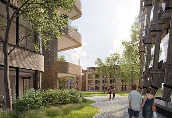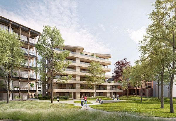 Het meest opvallende bouwblok hierbij is het gebouw aan de rand van de Leie, het dichtst bij de Broeltorens. Om niet te concurreren met de stenen architectuur van de torens, wordt de betonnen draagstructuur van het gebouw ingevuld en afgewerkt met hout. De diepte en schaduwwerking van het hout zorgen voor een lichte architectuur die ruimte laat voor de massiviteit van de Broeltorens. De andere gebouwen liggen verder van de Broeltorens en worden uitgevoerd in verschillende soorten baksteen. Hierdoor sluiten ze aan op de bestaande woningen rondom, die ook uitkijken op het binnenplein.