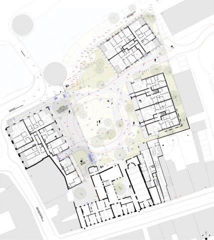 Analoog aan de opbouw van het aanpalende Leieboorden-project van awg architecten, worden de nieuwe gebouwen zoveel mogelijk aan de rand van de site geplaatst. Hierdoor ontstaat in het midden een open ruimte, die zowel het reeds aanwezige groen als de bestaande stedelijke doorgangen opnieuw toegankelijk maakt. De deels verzonken binnentuin wordt omarmd door een zitmuur die verwijst naar de loop van de oude, verdwenen stadsmuur. Bestaande poorten en historische gevelrelicten worden bewaard om de identiteit van de plek verder te waarborgen.