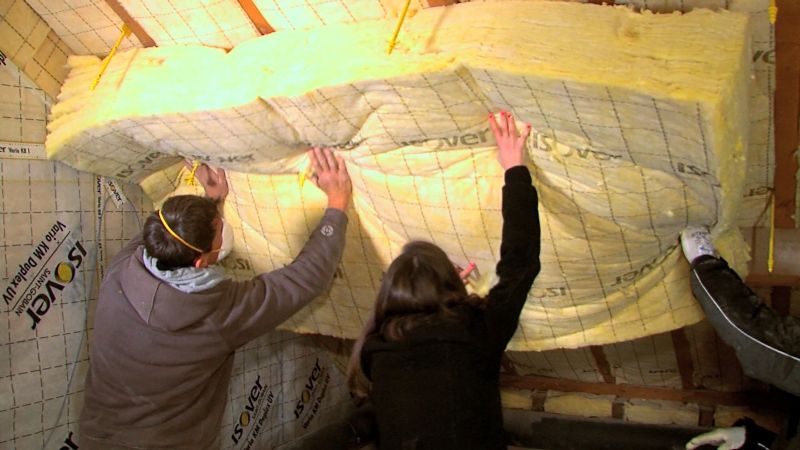 Bovenaan beginnen, dat moeten ze bij Saint-Gobain gedacht hebben. Ze gaven het dak een isolerende laag van zo’n 30cm glaswol. Omdat tussen de kepers slechts plaats was voor 6cm isolatiedikte werd de bijkomende 24cm isolatie op ophangstangen geprikt. Deze stangen fungeren ook als drager van het vochtregulerend lucht- en dampscherm dat luchtdicht geplaatst werd met behulp van kleefband en dichtingsmastiek. Het resultaat is een dak met een U-waarde van 0,12 W/m2K dat voldoet aan de passiefhuisnorm.