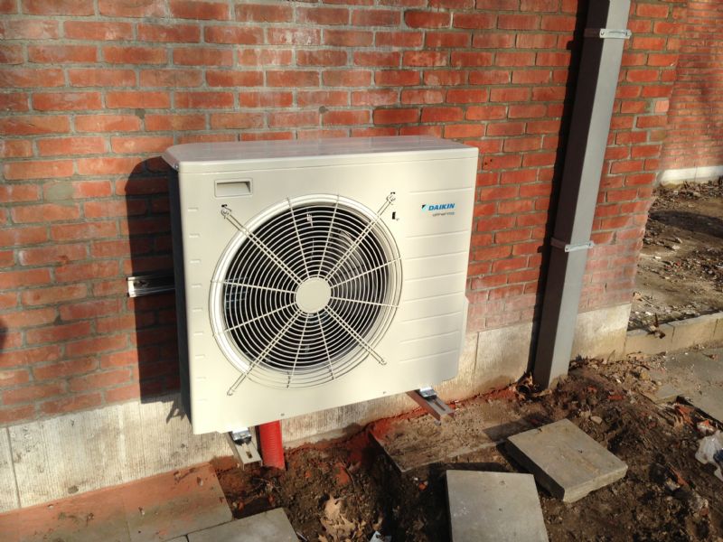 Het opwarmen van het water voor de centrale verwarming en het sanitair gebeurt via fotovoltaïsche panelen en een warmtepomp van Daikin. Dit Altherma-systeem bestaat uit een buitenunit die warmte aan de lucht onttrekt en die via de binnenunit en de inox warmwatertank voor het sanitair voorziet. Hetzelfde systeem levert het warme water voor de vloerverwarming op het gelijkvloers en de verwarming via ventiloconvetoren op de twee etages.