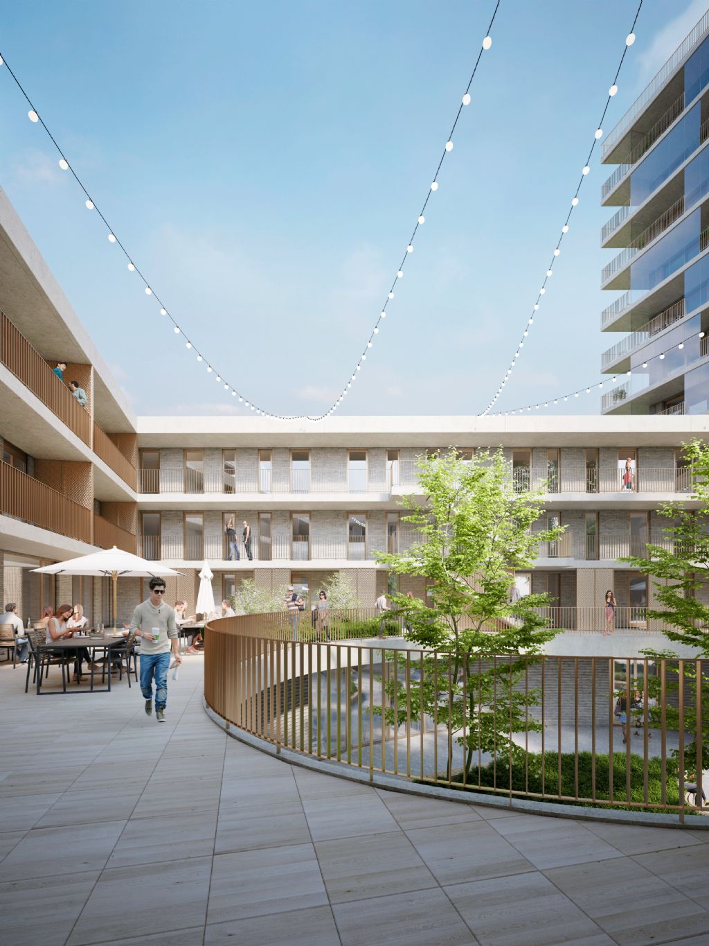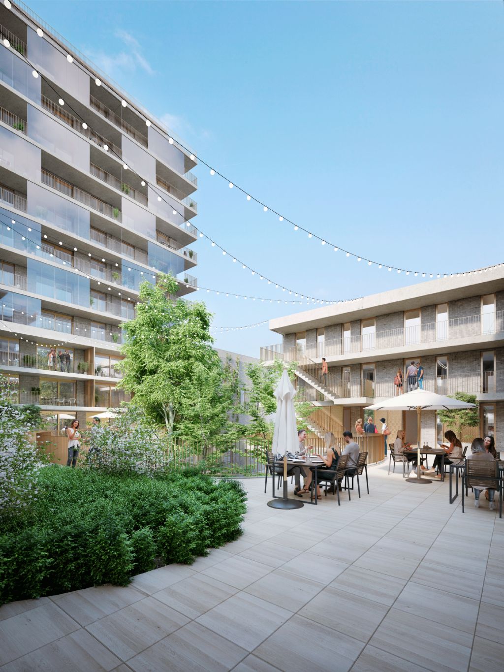 De perken worden afgezoomd door banken die de buren aansporen om rustig de tijd te nemen om met elkaar in contact te komen. Groene terrassen en bomen geven het project het gevoel van de moderne urban jungle, en passen zo in de strategie om jonge mensen aan te trekken met zin voor avontuur.