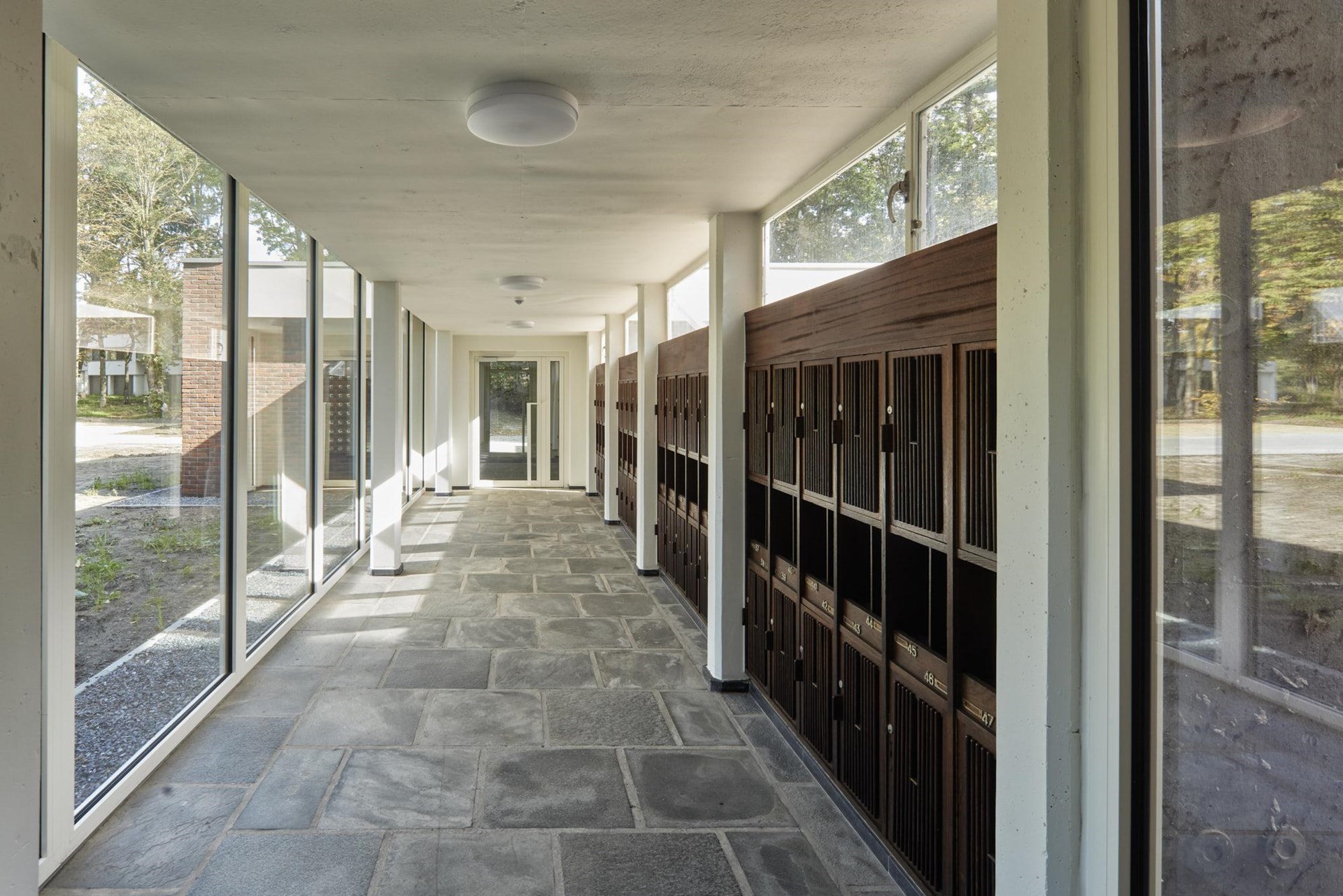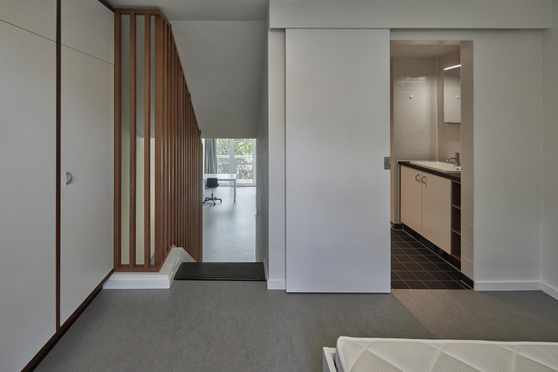 Ondanks de complexe opbouw van het gebouw – grote en kleine studio’s in splitlevel gekoppeld aan gaanderijen die in doorsnede afwisselen met de slaapgedeeltes van de grote studio’s, slaagde de architect erin om het oorspronkelijk materiaalgebruik te evoceren, maximaal te respecteren en een energetisch verantwoorde bouwschil te creëren.