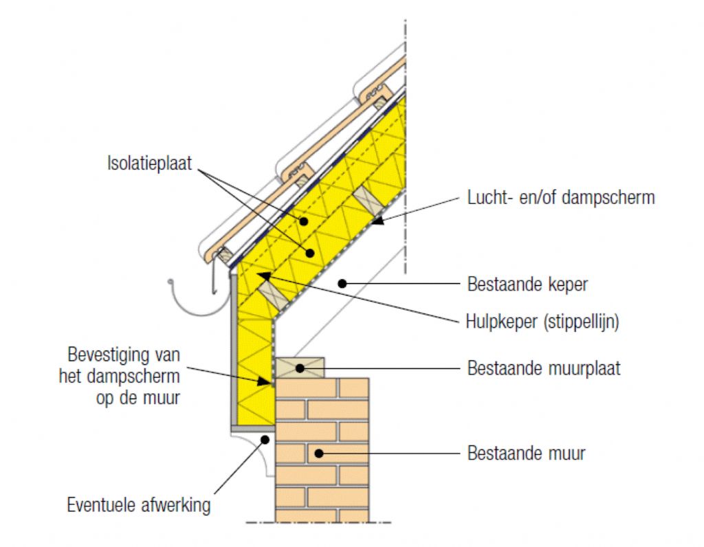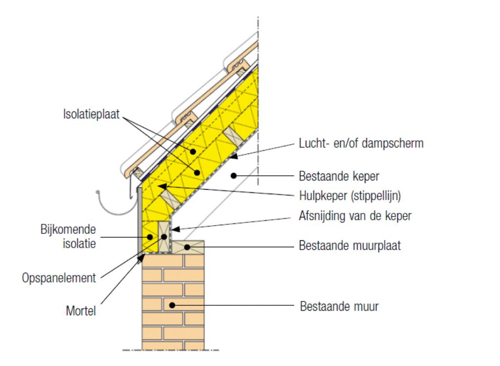 De hieronder beschreven situaties zijn van toepassing bij de renovatie van hellende daken van gebouwen met niet-geïsoleerde volle muren (anderhalve steen). Hieronder valt een aanzienlijk deel van het bestaande gebouwenpark dat dateert van vóór de Tweede Wereldoorlog. Afbeeldingen 2 en 3 illustreren twee oplossingen waarbij de muurplaat zich respectievelijk aan het binnen- en het buitenvlak van het metselwerk bevindt.