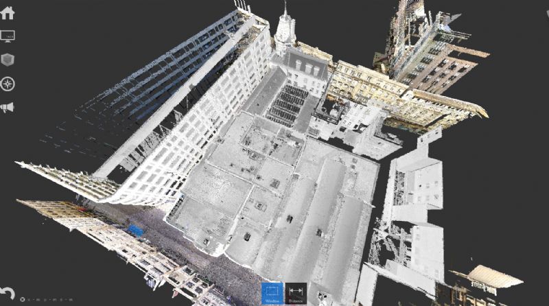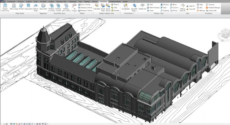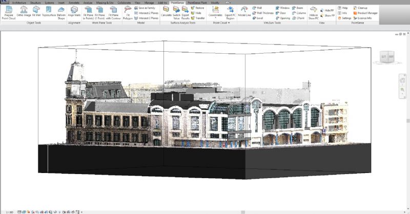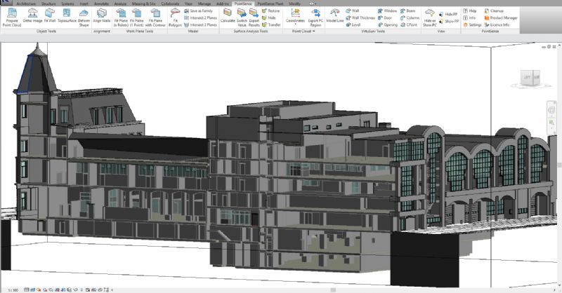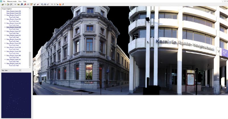 “Voor de opmeting aan de hand van 3D-laserscanning hebben we 965 scanposities genomen zodat we een complete en zeer gedetailleerde puntenwolk hadden als eindresultaat. De uitwerking van de puntenwolk naar een Revit BIM-model hebben we uitgevoerd met voor de gevelaanzichten een LOD300(+) en het interieur LOD200(+). Het interieur werd opgemaakt met de Phasering 'bestaande toestand' zodat de ontwerpers (8 Office Architects, Veelaert architecten, HCDemyttenaere architecten) verder op het model kunnen werken. Eveneens werd de scandata gekoppeld aan enkele ingemeten targets door een landmeter-expert en werden de omliggende straten als een correcte Toposurface opgemaakt.”