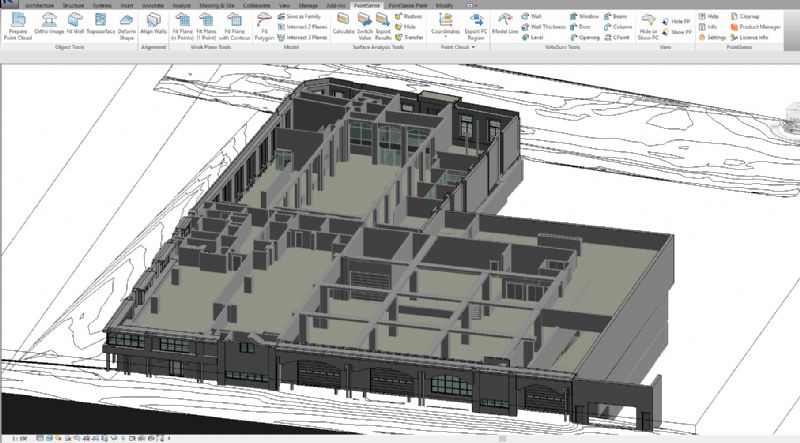 N² ’t Kwadraat kan met zijn gekoppelde software met Revit op een snelle manier een oppervlaktestudie maken die toegepast wordt om een perfecte Toposurface van de puntenwolk op te maken. Kerkhof: “Op deze manier kan dit ook verder toegepast worden op vloerplaten, muren,… die reeds meerdere malen gebruikt werden voor expertises. Natuurlijk bestaat de mogelijkheid om nadien te opteren om MEP-modellen of technieken (elektriciteit, HVAC, sanitair) bij te modelleren.”