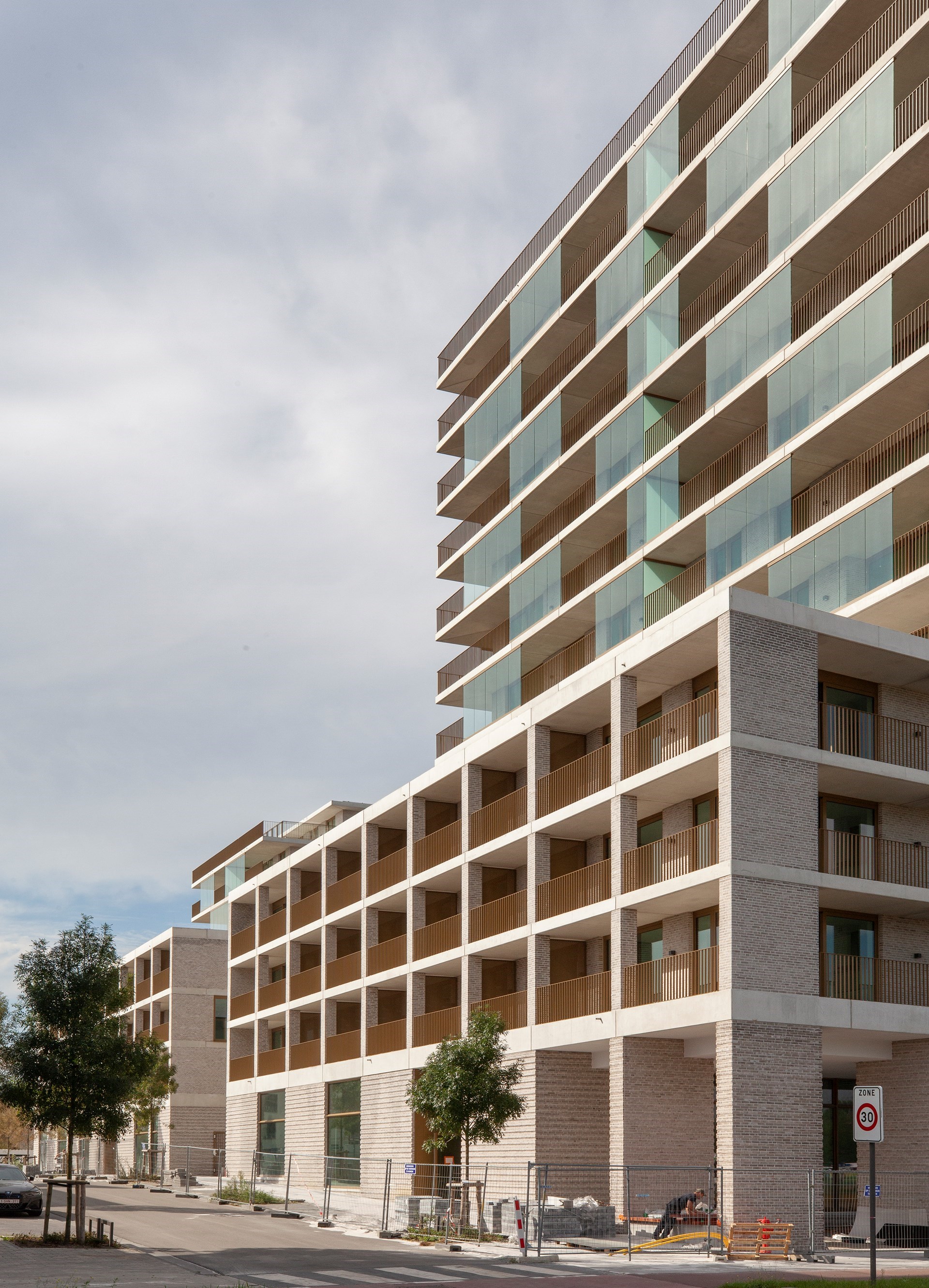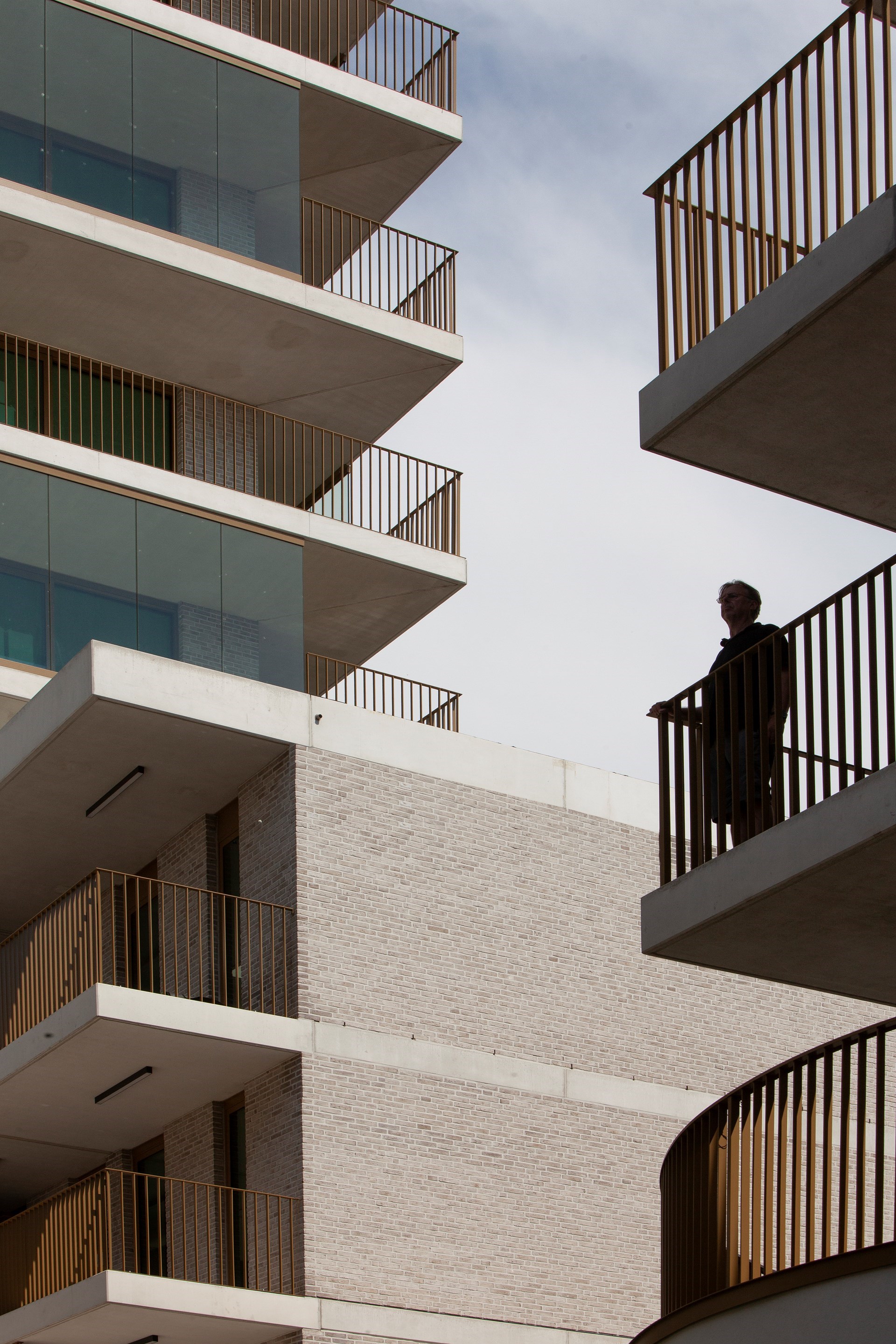 Dankzij de hoge ramen baadt elke ruimte in licht en wacht er op elk moment een spectaculair panorama. Elk appartement beschikt daarenboven over een bijzonder ruim privéterras tot wel 100 m². De glazen panelen aan de buitenzijde zorgen voor afwisselende gevelbeelden en weerspiegelingen van de lucht. Ze zorgen ook voor extra leefkwaliteit en bruikbaarheid doorheen het ganse jaar op de terrassen door hun functie als wind- en privacy scherm.