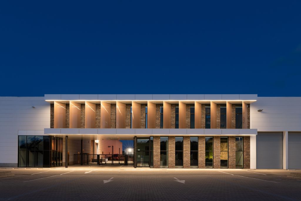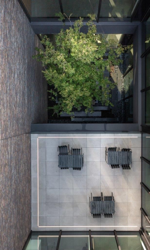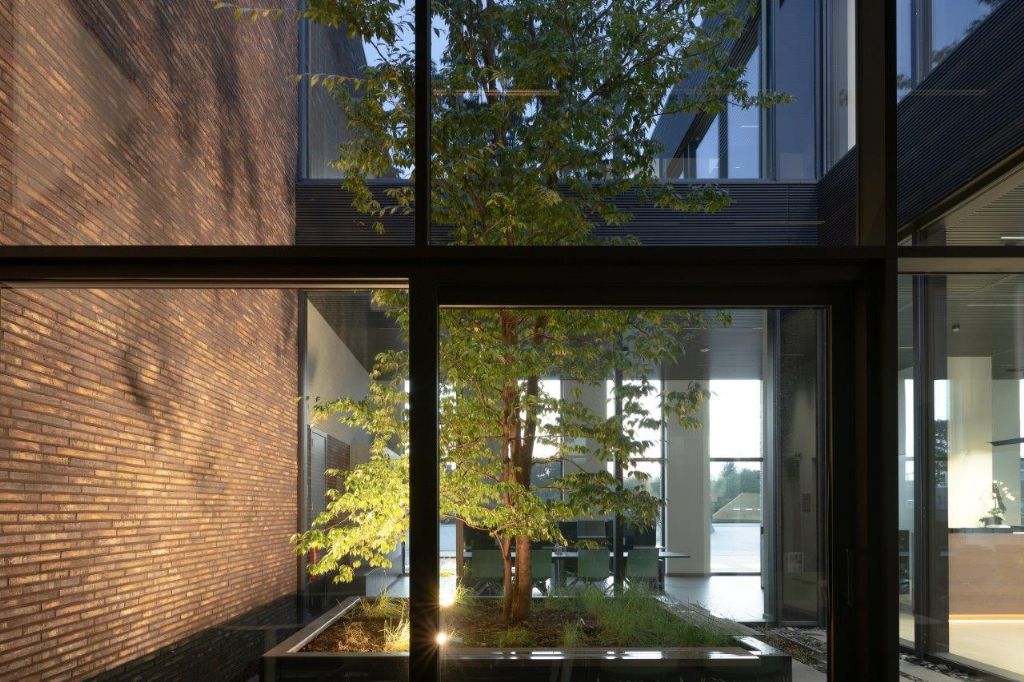 Belangrijk was om in de harde industriële omgeving toch een warme en aangename werkomgeving te creëren. Door de kantoren rond een groene patio te bouwen, worden licht en natuur naar binnen getrokken en houden de werknemers contact met de seizoenen.