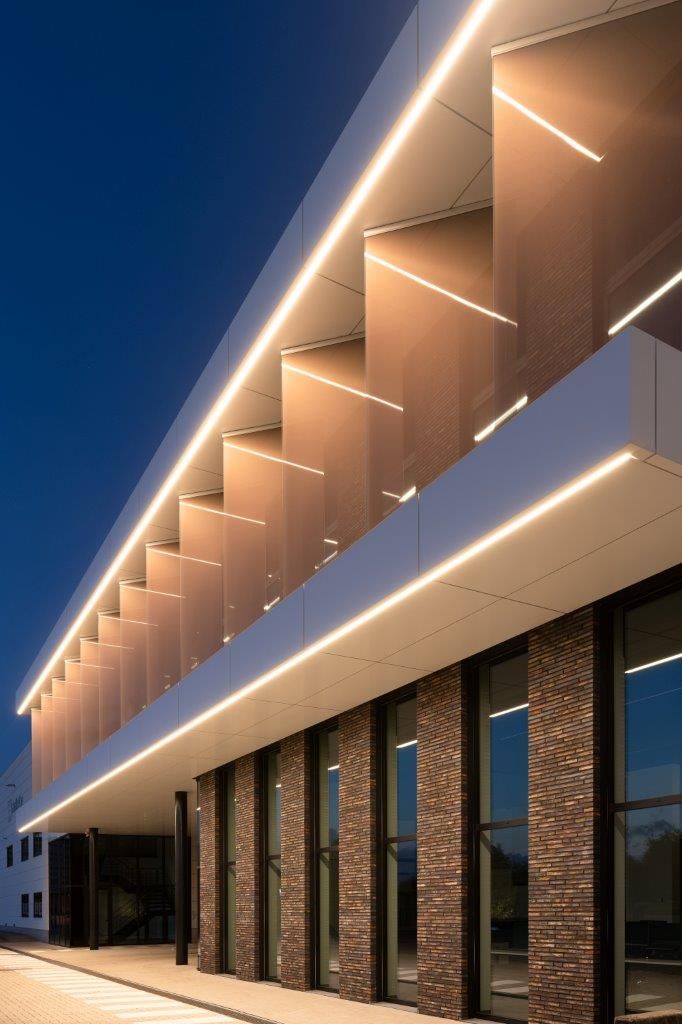 Daarnaast moest het gebouw de verschillende bestaande werkplaatsen verbinden en een geheel vormen met het hoofdkantoor van de groep Van Roey, dat ernaast ligt. Daarom werd net als voor het kantoorgebouw van Van Roey gebruik gemaakt van verticale, glazen lamellen met een koperkleurige doek, die de zon buiten houden en tegelijk het uitzicht naar buiten vrijwaren. Bij zonsondergang krijgt de gevel een warme, koperen gloed. Verder verwijzen de rode bakstenen van Petersen naar het vakmanschap dat ook bij Staalbeton primeert. De baksteen zien we ook terug in de patio.