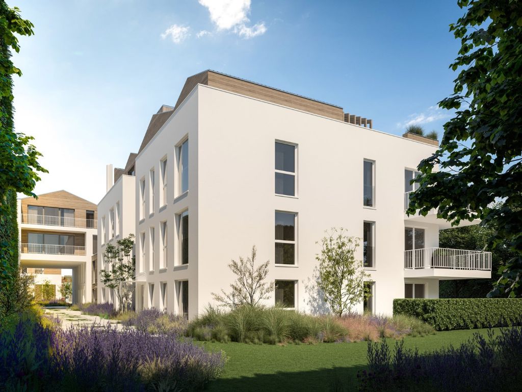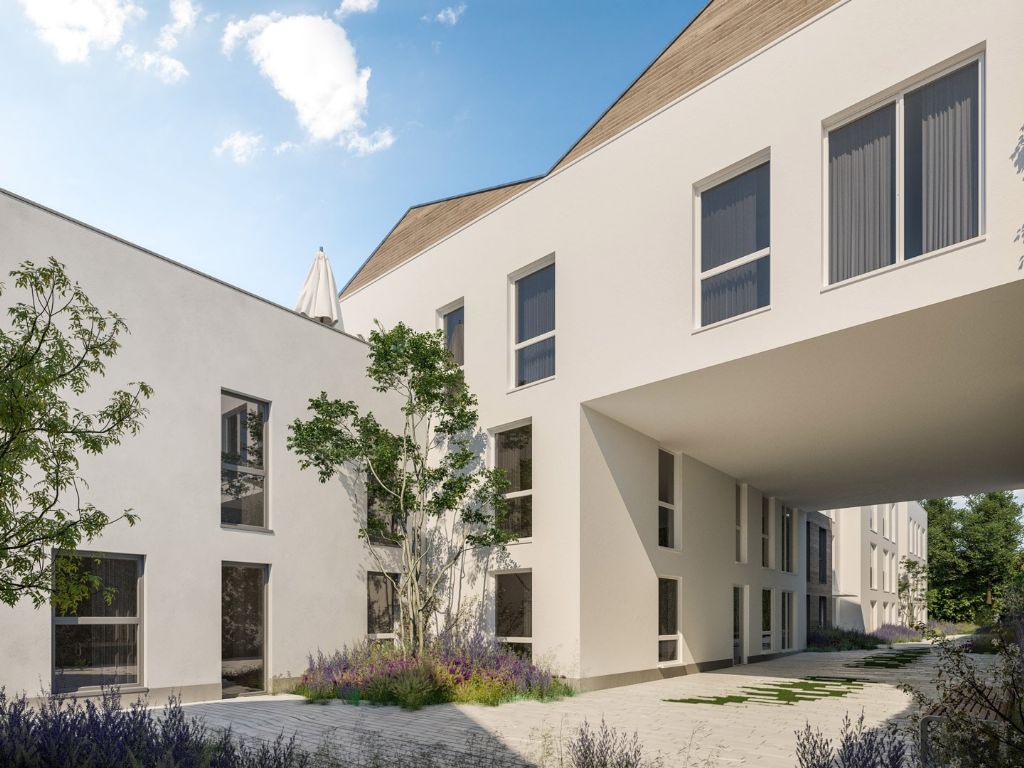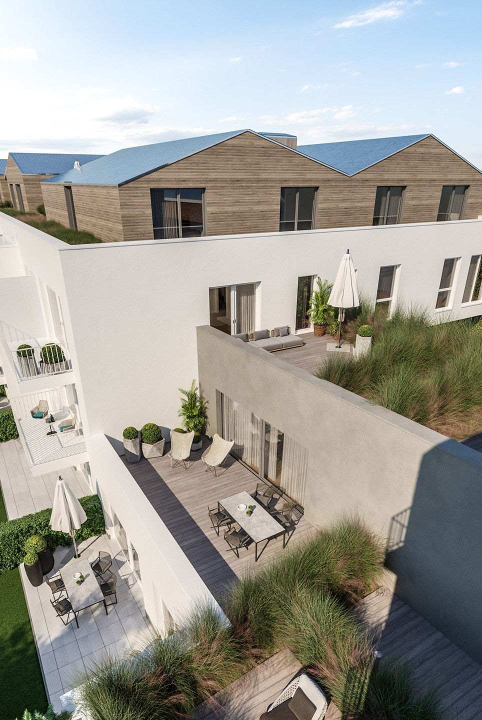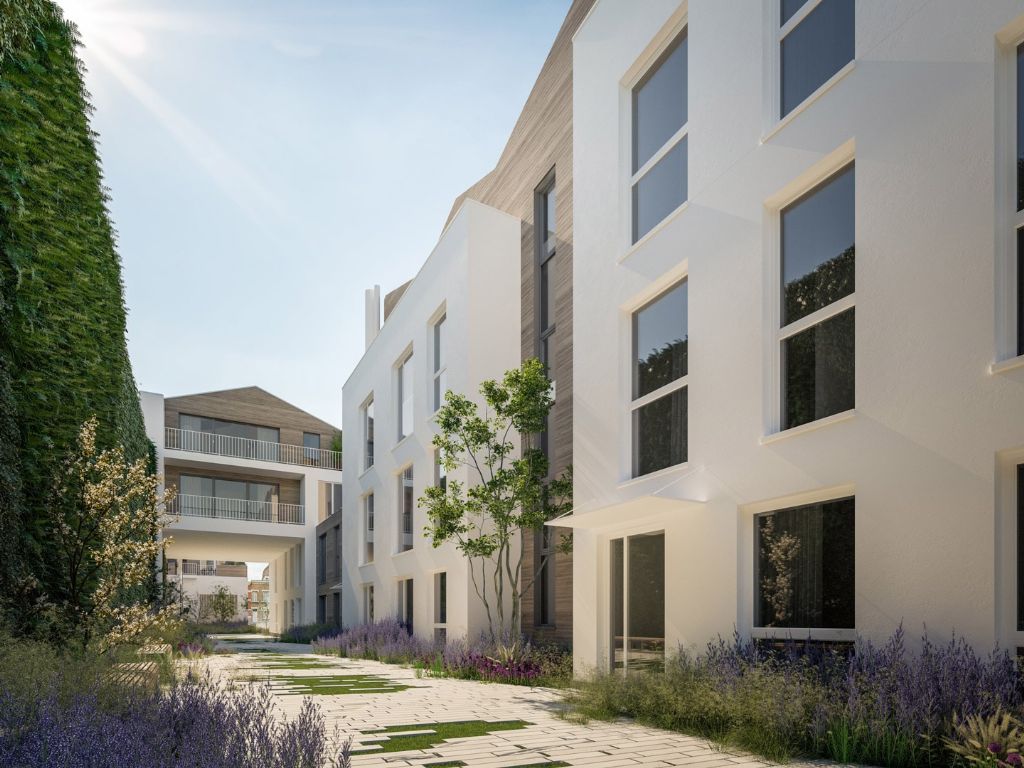 Het hoofdvolume dringt tot in het binnengebied door. Aan de noordzijde leidt het nieuwe voetgangerssteegje naar de verschillende ingangen en de gemeenschappelijke tuin. Aan de zuidkant genieten de privétuinen en -terrassen van de appartementen van een overvloed aan zonlicht.