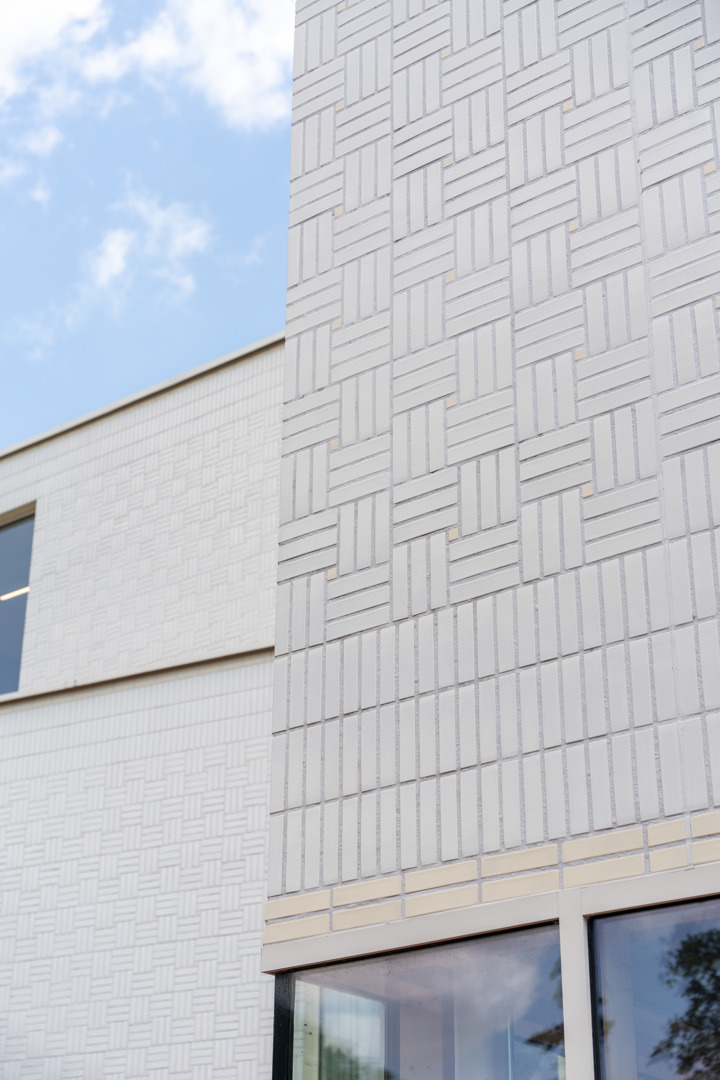 Het gebouw wordt omschreven als een architecturaal landmark, letterlijk zichtbaar vanop afstand. De gevelafwerking met geglazuurde steenstrippen en een verfijnd 40x40 rasterpatroon maakt het gebouw herkenbaar en levendig. Waar het ontwerp initieel vertrok vanuit betonbanden, kozen de architecten uiteindelijk voor een meer verfijnde gevel met horizontale banden, verschillende patronen en het opvallende windmolenmotief. Op de ontwerptafel werd dit tot in detail uitgetekend en getest met stalen, zodat de maatvoering van de steenstrippen volledig overeenkwam en geen enkel element moest worden bijgeslepen. Het resultaat is een dynamisch gevelbeeld, waarin gedraaide steenstrippen en diamantaccenten zorgen voor een spel van licht en reflectie dat het gebouw extra karakter geeft.