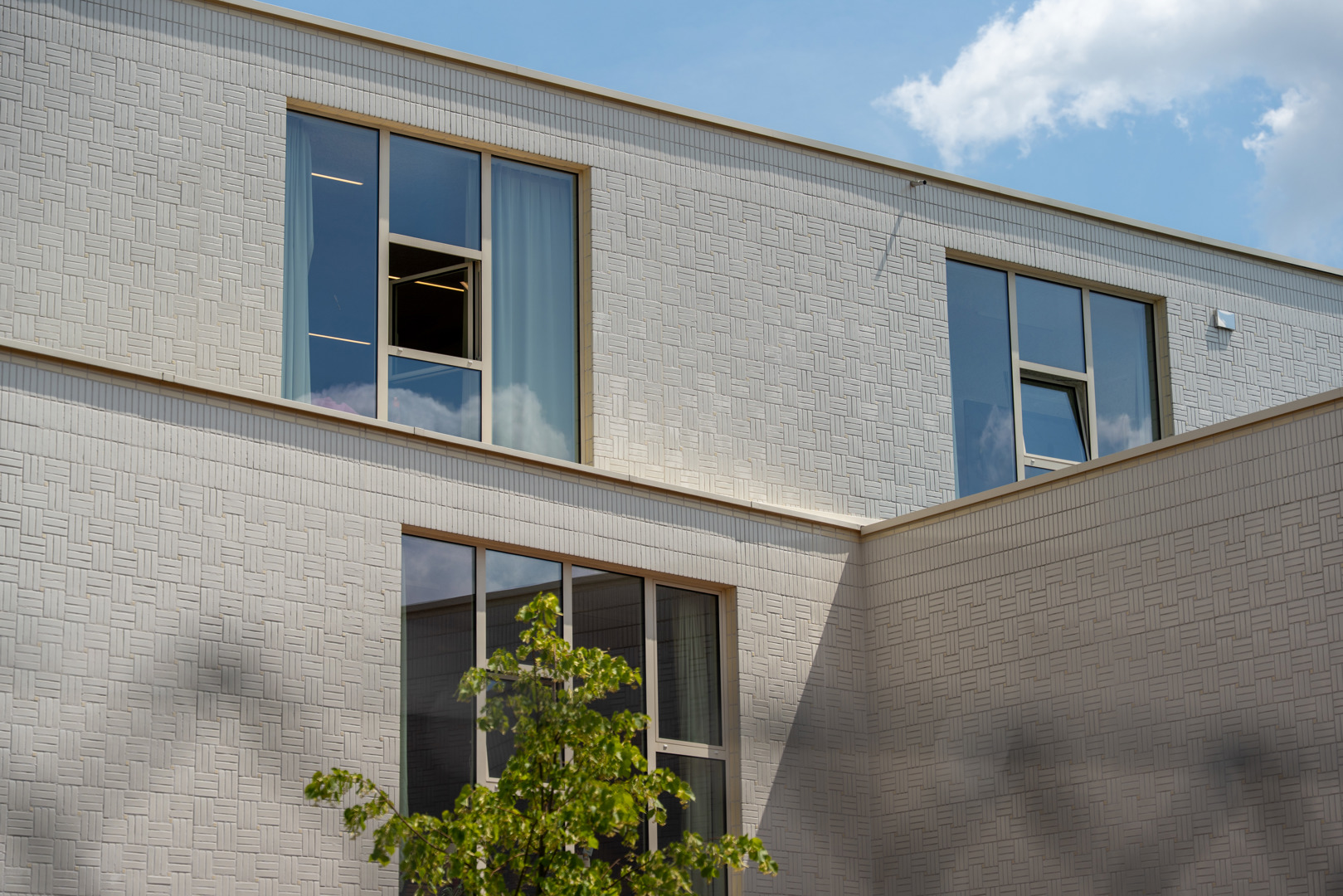 De geglazuurde steenstrippen zijn niet alleen een esthetische keuze, maar ook een duurzaam op lange termijn: onderhoudsvriendelijk en bestand tegen veroudering. Door hun beperkte dikte van 17 mm in plaats van 25 mm wordt minder materiaal gebakken en vervoerd, wat ook de ecologische impact aanzienlijk verkleint, ideaal voor een schoolomgeving.