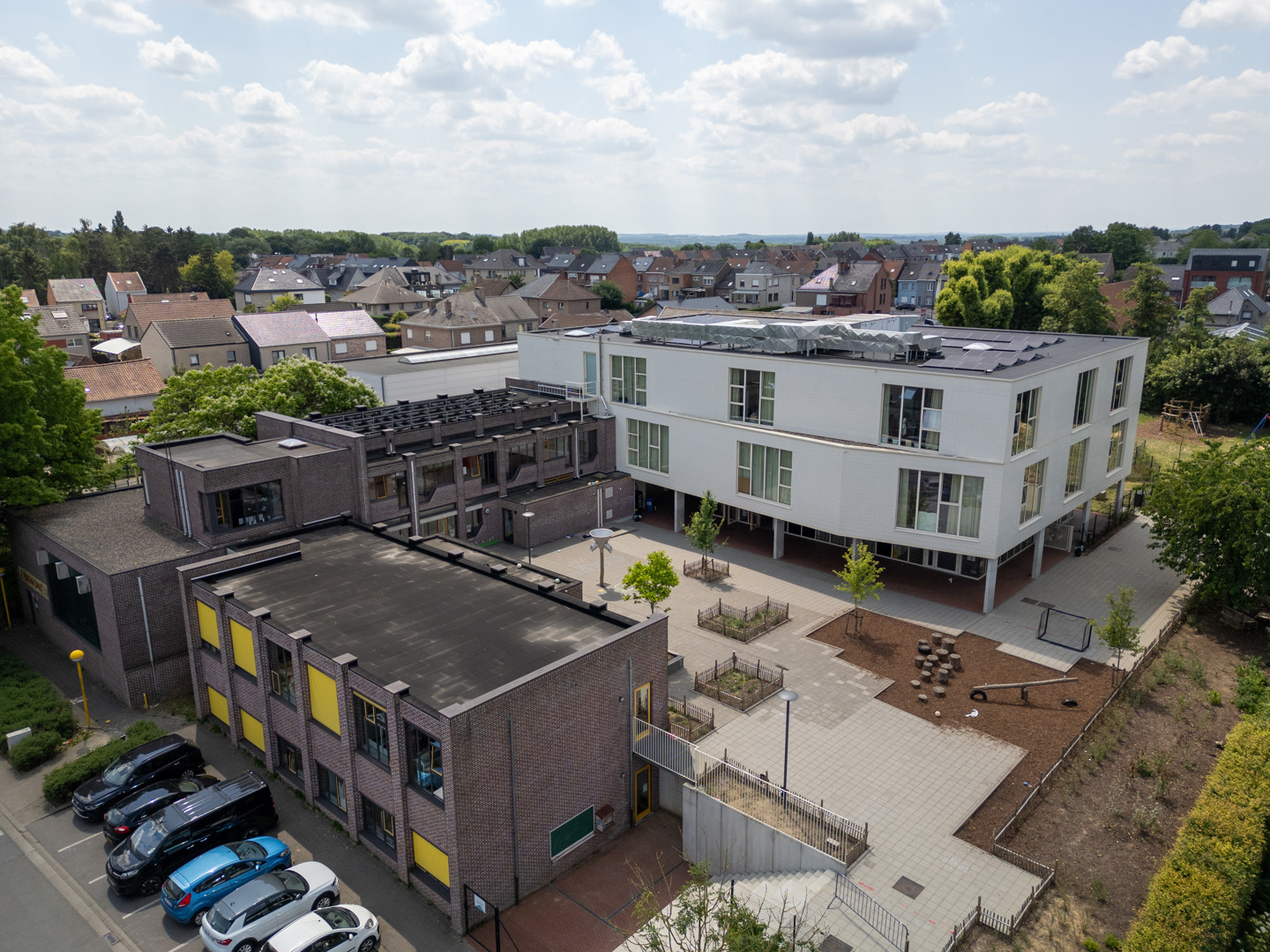 Waar de oude gebouwen eerder gesloten, zwaar en gefragmenteerd oogden, brengt de nieuwbouw lichtheid, openheid en transparantie. Open polyvalente ruimtes en slimme circulatie zorgen zo voor licht, ademruimte en een optimale leeromgeving voor de kinderen. De site van de basisschool maakt bovendien deel uit van een grotere cluster met lokalen van de jeugdbeweging KKOS, de parochiezaal, een ruime parking langs de Dendermondsesteenweg en de dorpskerk. Door die koppeling vormt de school een prominente en actieve schakel waar verschillende actoren samenkomen.