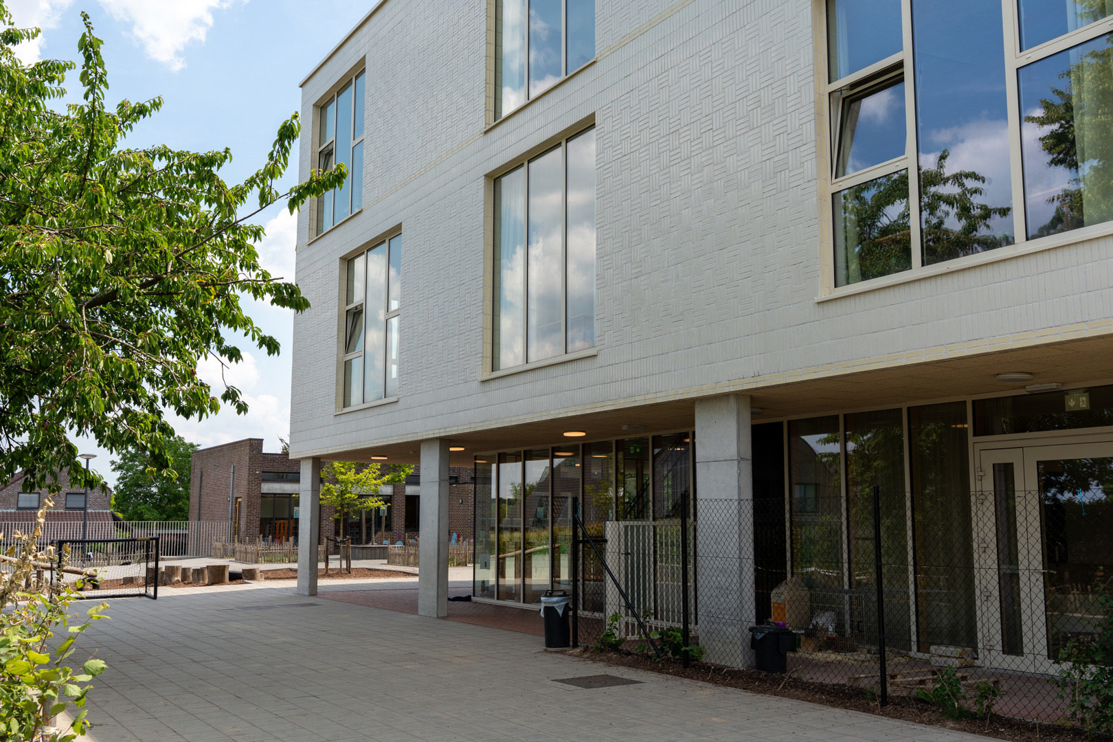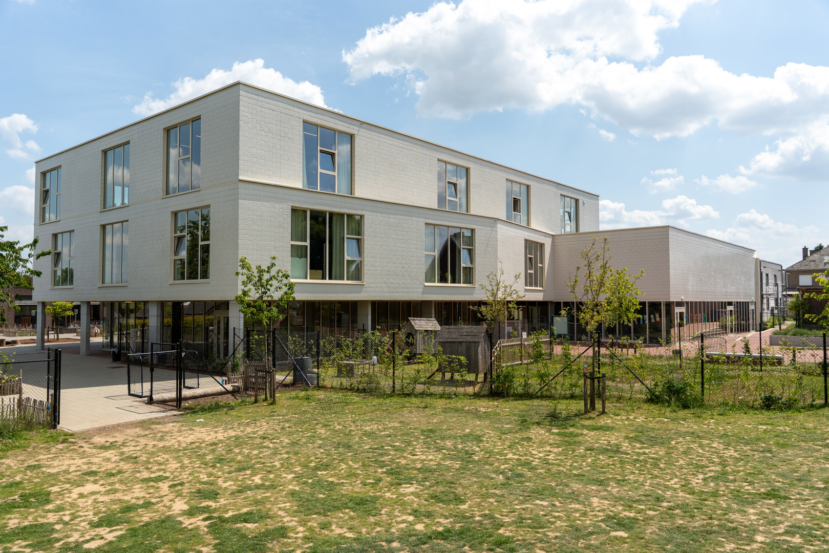 De opdracht was duidelijk: de capaciteit van de school verdubbelen. Daarbij werd een deel van de bestaande gebouwen strategisch afgebroken om een open verbinding te maken met de groene omgeving achter de site. Het nieuwe volume onderscheidt zich bewust van de bestaande bebouwing en creëert tegelijk een sterke connectie tussen binnen en buiten.