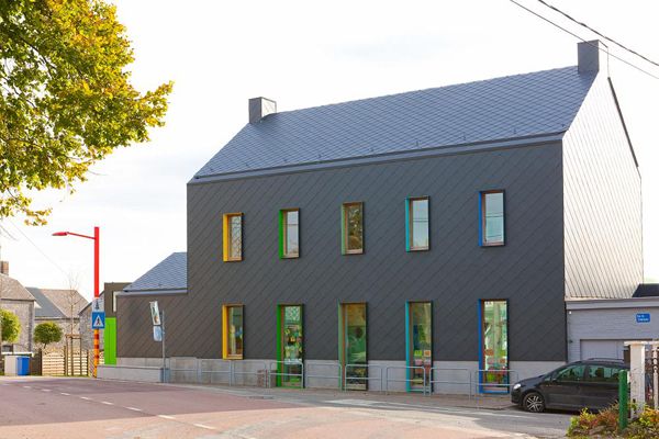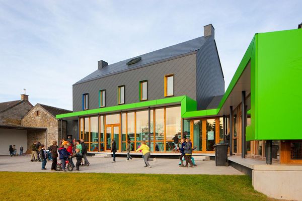 Volgens de toonaangevende Amerikaanse krant The Huffington Post is de school van Barvaux-Condroz één van de 40 mooiste ter wereld. De gemeente renoveerde de school niet zo heel lang geleden. Tegelijkertijd breidde ze het gebouw uit. Door de gevel te bekleden met leien houdt LR Architects de koude buiten.