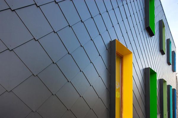 Het oog van de architecten viel op de Eternit Alterna lei 40/40/10 in een donkergrijze kleur. Deze heeft een sterke weerstand een duurzaamheid, waardoor ze kleurvast en mooi blijft, zelfs bij voortdurend slecht weer. Felgekleurde vormen doorbreken het grijze palet van de gevel. Achter de ramen komt het energieke karakter van de school naar voren.