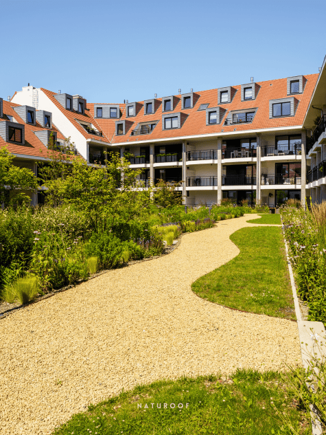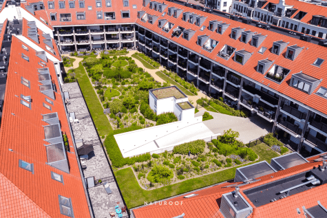 Een binnentuin van een appartementencomplex is immers een ideale plek om het water van de rondom gelegen gebouwen op te vangen: we kunnen dit dak dus gaan inrichten als retentiedak. Door middel van een slimme sturing kun je er zelfs een echte “waterhub” van maken die het water zal sturen naar waar er op dat moment behoefte aan is: als de beplanting van de binnentuin water nodigt heeft, blijft het water in het retentiedak; is er nood aan water voor de voeding van de toiletten van de gebouwen, dan kan het water daarheen gestuurd worden; is er een groene gevel in het gebouw, dan kan je ook voor de watervoorziening daarvan het water gaan gebruiken; en wordt er volgende week een zware regenbui voorspeld, dan kan ruimte gemaakt worden in de retentiekratten om het regenwater te bergen zodat de riolering tijdens de bui niet overbelast wordt.