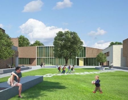 Het trechtervormige plein is aan 2 zijden omsloten door woningen en appartementen en opent zich naar het nieuwe cultureel centrum. Het centrale plein vormt een aaneenschakeling van verschillende publieke ruimtes. Een sterk doorwaadbaar groen binnenplein loopt over naar een volledig verhard evenementenplein. Diliën Architecten ontwierp de woningen.