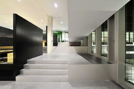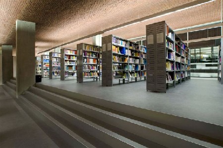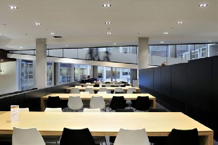 In de laagste zone van het gebouw, waar cafetaria en mediatheek de helling trapsgewijs volgen, wordt het hellend terrein in het project geïntegreerd. De trappen en treden zijn vooral prominent aanwezig in de openluchtpatio. Ze doen daarbij ook meteen dienst als zitplaatsen. De patioruimte is een opvallend stille ruimte midden in de drukke stad. In de onderste vier bouwlagen wordt bovendien het trapgebruik gestimuleerd door grote uitnodigende trappenhuizen met daglicht. De verbinding tussen de onderste bouwlagen realiseerde men met hellende vlakken. Deze zijn nuttig voor rolstoelgebruikers maar maken van de wandeling doorheen het gebouw een bijzondere ''promenade architecturale''.