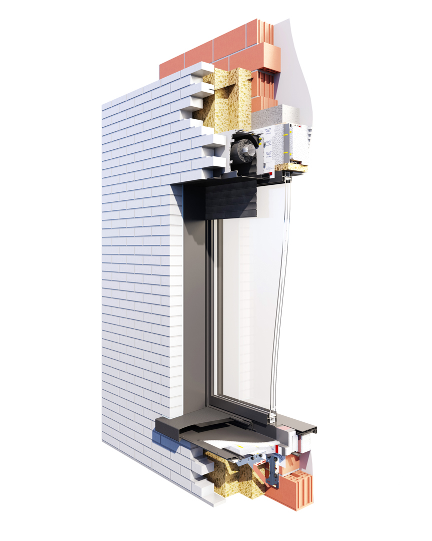 ShutterX wordt volledig geïntegreerd in de spouwmuur en is in opgerolde toestand geheel onzichtbaar, zowel aan de binnen- als buitenzijde. Zelfs de onderlat verdwijnt volledig in de kast, wat resulteert in een zuiver gevelbeeld zonder zichtbare rolluikelementen.