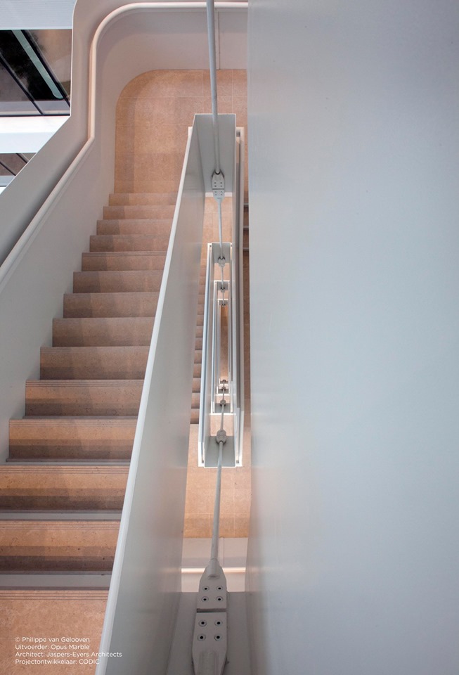 In een voormalige terminal op Brussels Airport is het complex ‘Passport’ verrezen: een state-of-the-art kantoorgebouw waar onder meer KPMG en Microsoft vestigingen in hebben ondergebracht. Jaspers-Eyers Architects zorgde voor het ontwerp. In het interieur springt de vloer-en trapbekleding meteen in het oog. Het gebruik van de Egyptische kalksteen Sinai Pearl van Beltrami Natural Stone heeft daarin een belangrijke rol gespeeld.