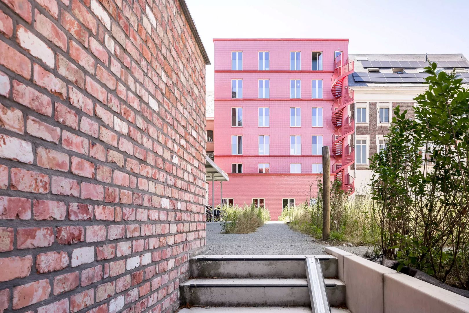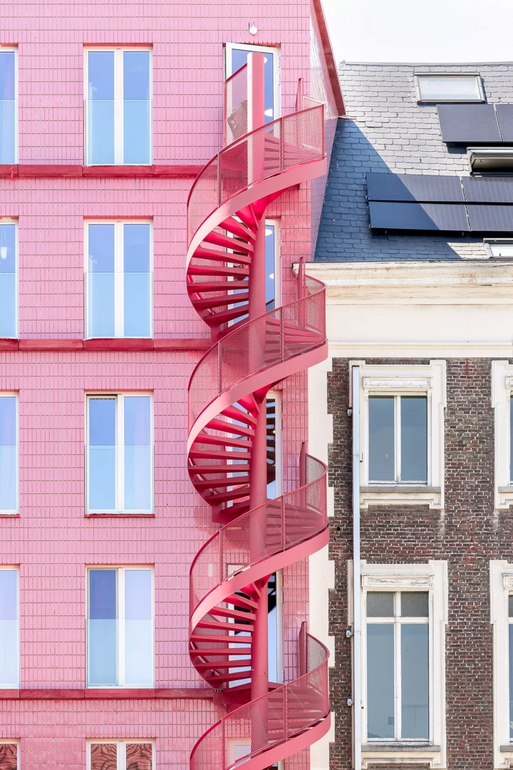 Aan de achterzijde krijgt het project een expressieve toets dankzij een sculpturale, slingerende trap die het geheel een lichte dynamiek geeft. Zowel voor- als achtergevel zijn uitgewerkt in duurzame, tijdloze materialen, met veel aandacht voor detail en integratie. Het Sint-Annahuis toont hoe architectuur, erfgoed en vergroening elkaar kunnen versterken binnen een dense stedelijke context, en hoe doordachte studentenhuisvesting kan bijdragen aan een betekenisvol en toekomstgericht bouwblok.
