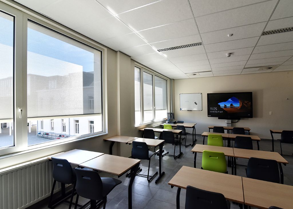Een groot aandachtspunt bij het renovatieproject was luchtdichtheid. Bijgevolg was het van groot belang om na te denken over een oplossing dat het schoolgebouw voldoende koel zou houden om zo een gezonde leeromgeving te garanderen. Om oververhitting tegen te gaan voldoet een basisventilatie vaak niet en is buitenzonwering cruciaal. Ook bij dit project was deze stelling van toepassing. Er werd gekozen voor onzichtbare doekzonwering van zonweringspecialist Duco die op een natuurlijke en energiezuinige manier de opwarming van het gebouw tegenhoudt en zo de koellast tot 63 % verlaagt.