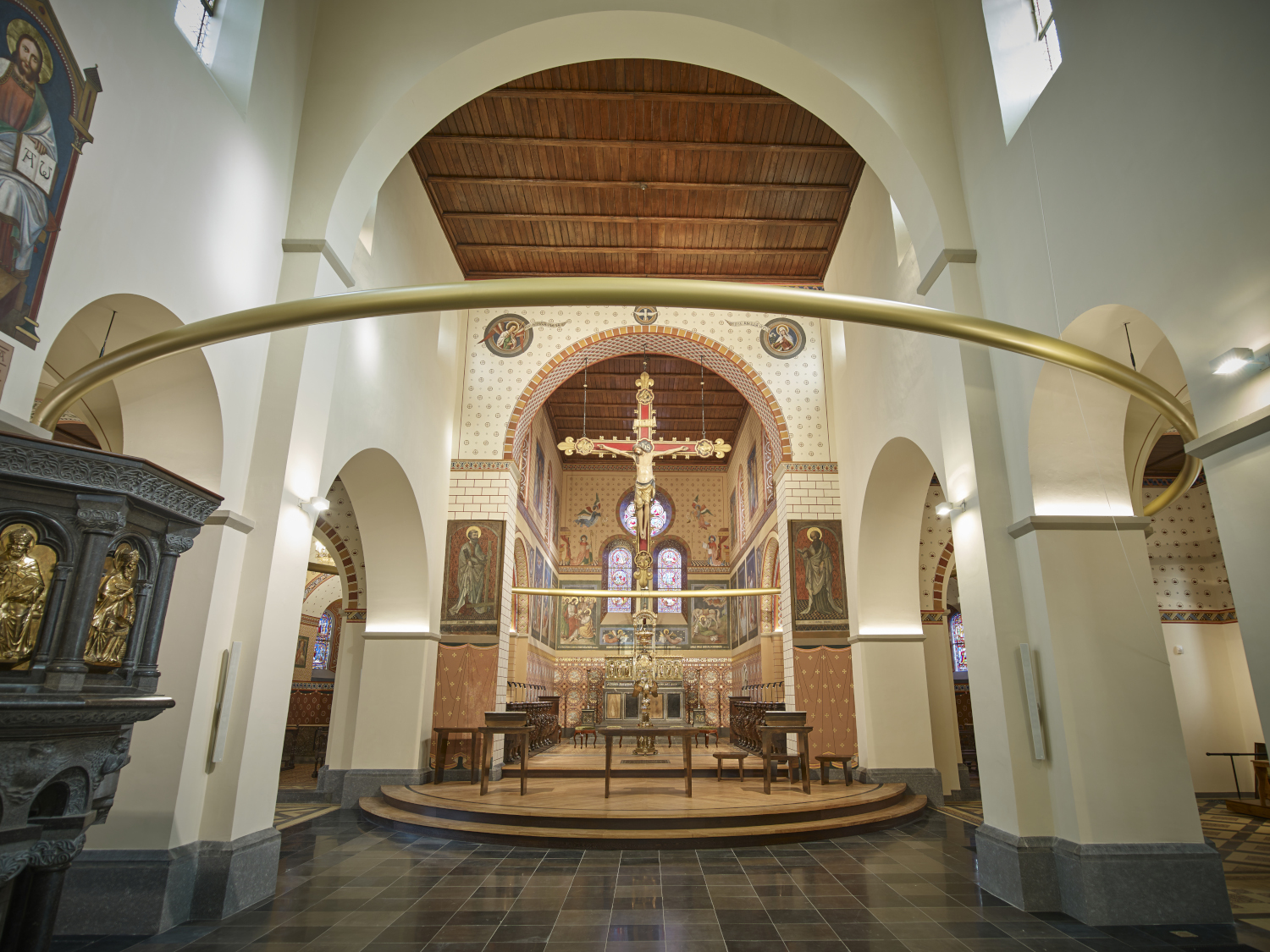 Het hart van deze kerk heeft een ‘HALO’ gekregen. Deze ring, een kunstwerk van het duo Gijs Van Vaerenbergh, is nooit in één keer in zijn geheel zichtbaar en wordt toch steeds als ring ervaren door de toeschouwer. In zijn mentale perceptie verbindt hij zelf de stukken van de ring tot een geheel. De cirkel is een erg betekenisrijk symbool zowel binnen de christelijke traditie als daarbuiten. “De ring beschouwen we als een nieuw liturgisch symbool in combinatie met de bestaande liturgische symbolen: het altaar, de koorstoelen en het kruis. Elk object heeft zijn identiteit en betekenis, waarbij de ring duidelijk een hedendaags accent toevoegt”, aldus Gijs Van Vaerenbergh.