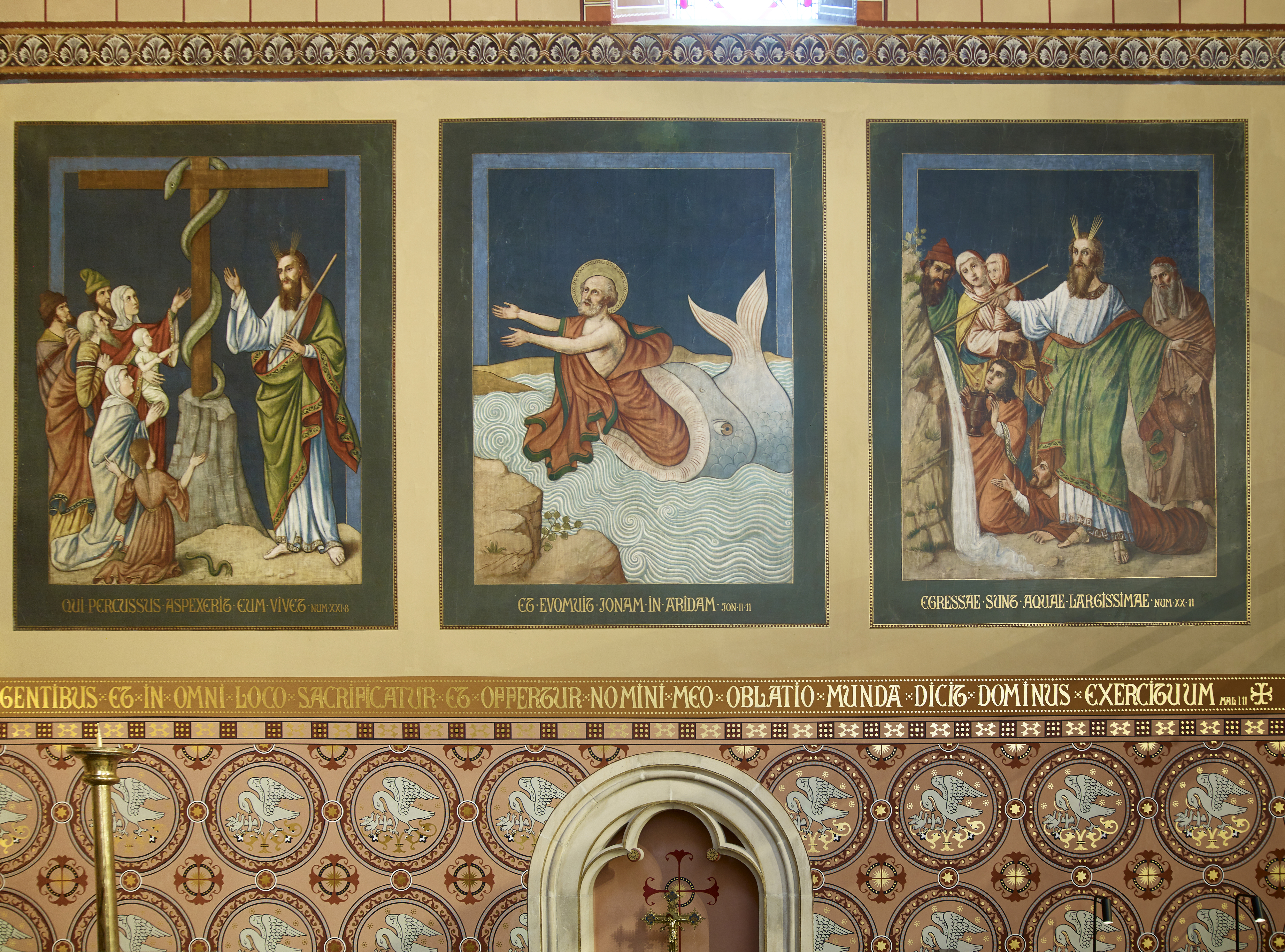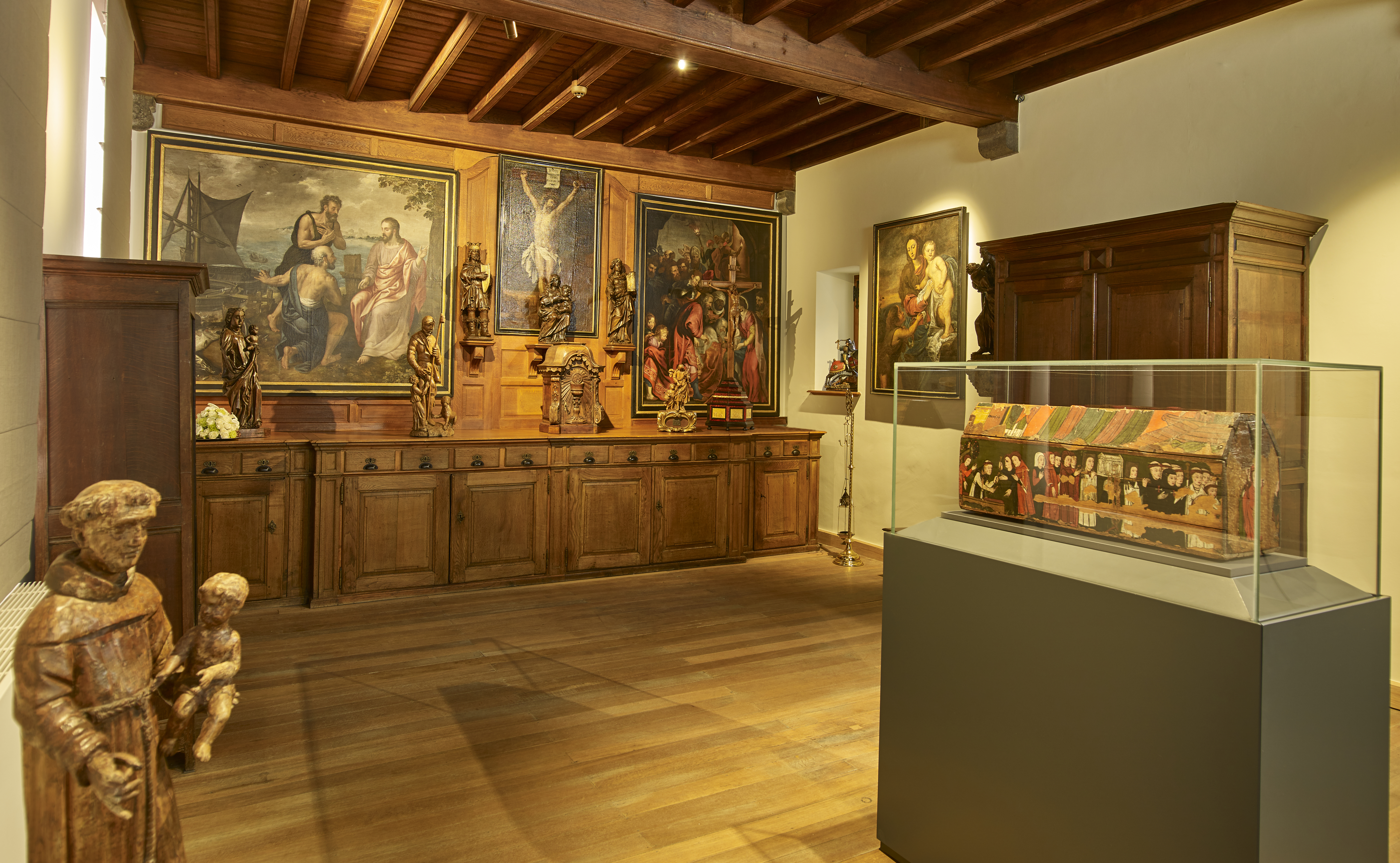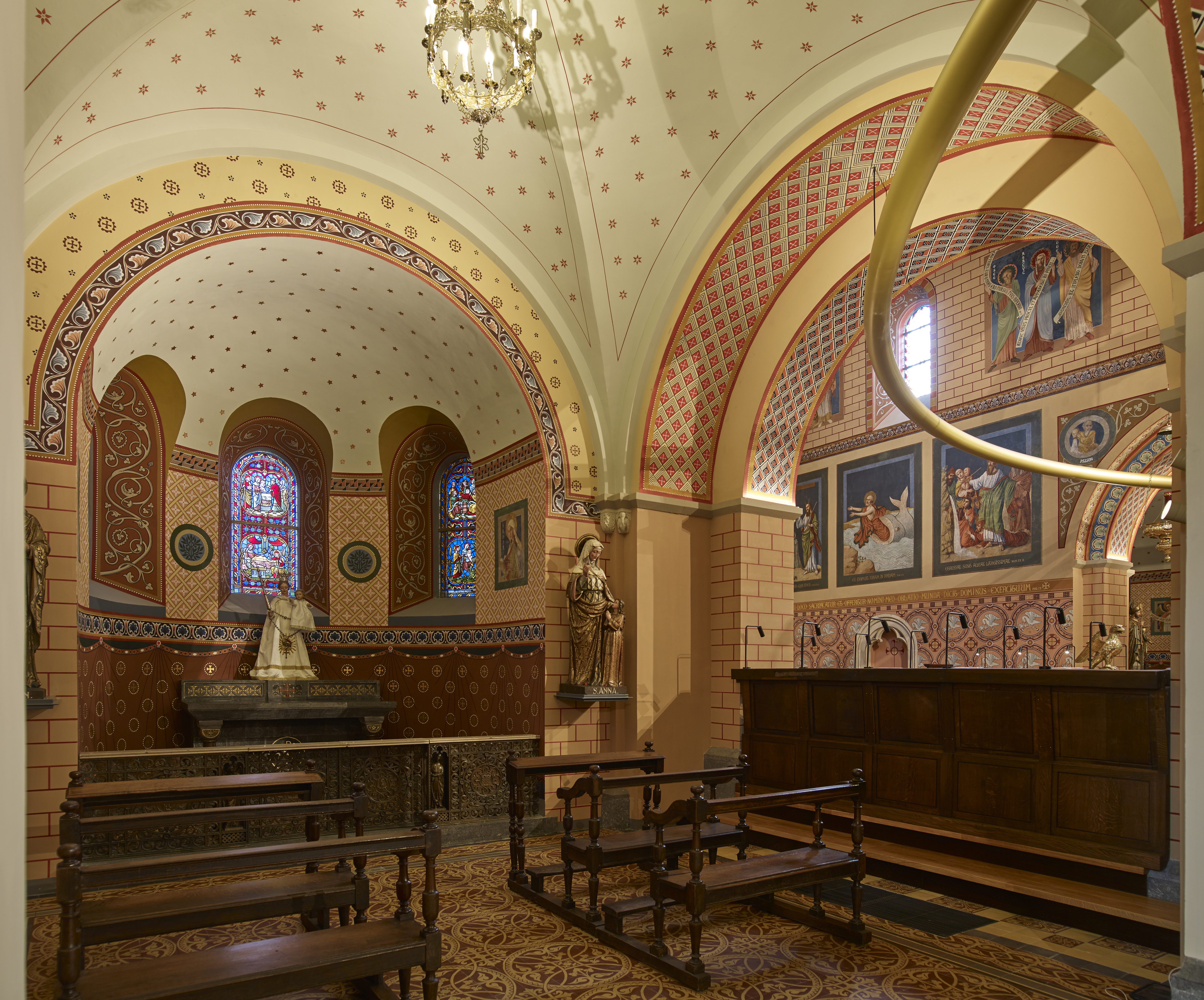 De zijkoren en het hoofdkoor zijn hersteld in hun volledig kleurenpakket waardoor zij een Byzantijns karakter krijgen. Aan weerszijden voor het hoogkoor vinden we een gotische secco uit de eerste helft van de 16e eeuw. Vooraan hangt het grote triomfkruis, met een gekruisigde Christus uit de 14e eeuw. Op de 4 uiteinden van het kruis zelf (19e eeuw) vinden we weer de symbolen van de 4 evangelisten: de adelaar (Johannes), de stier (Lucas), de engel (Mattheus) en de leeuw (Marcus).