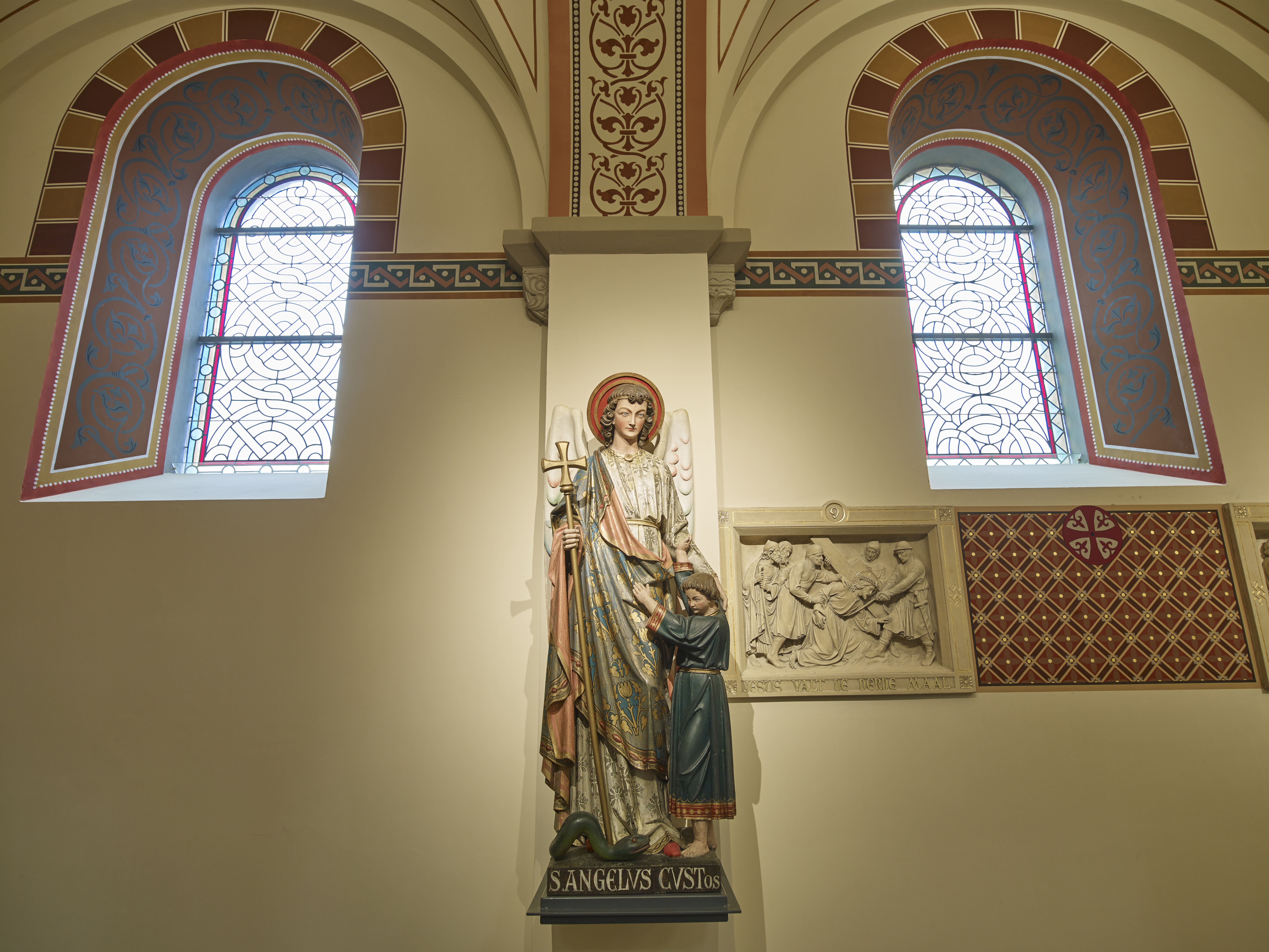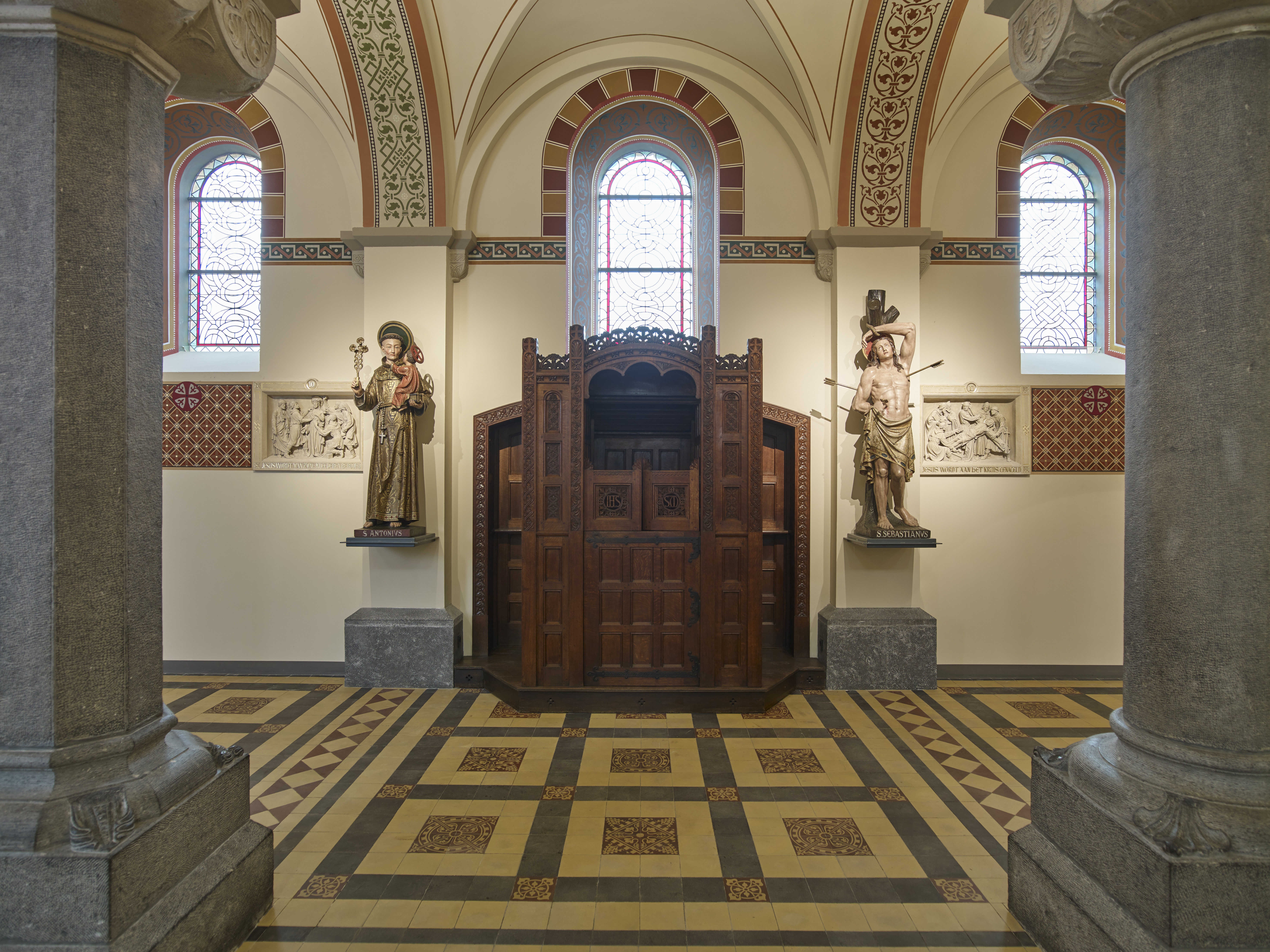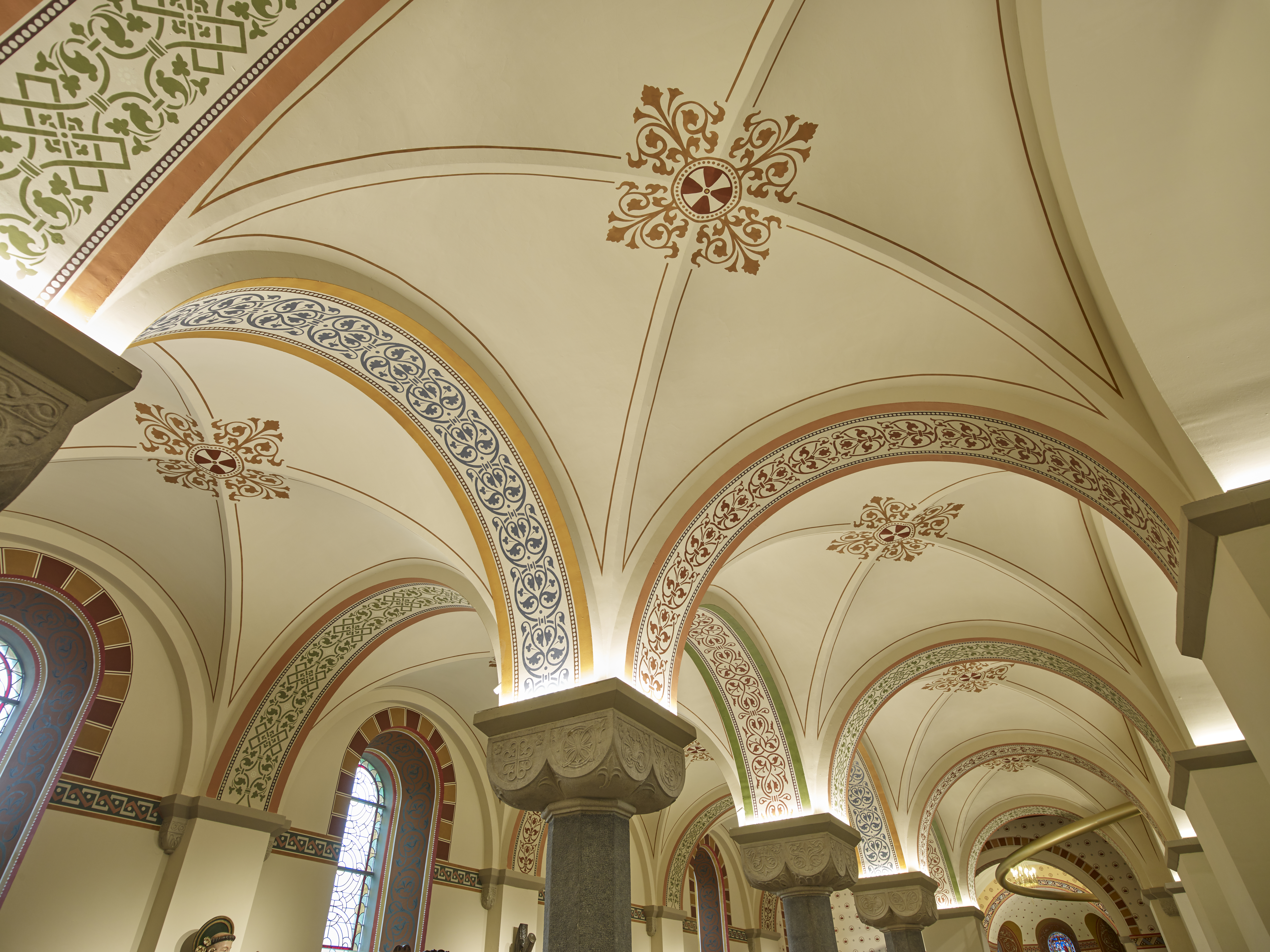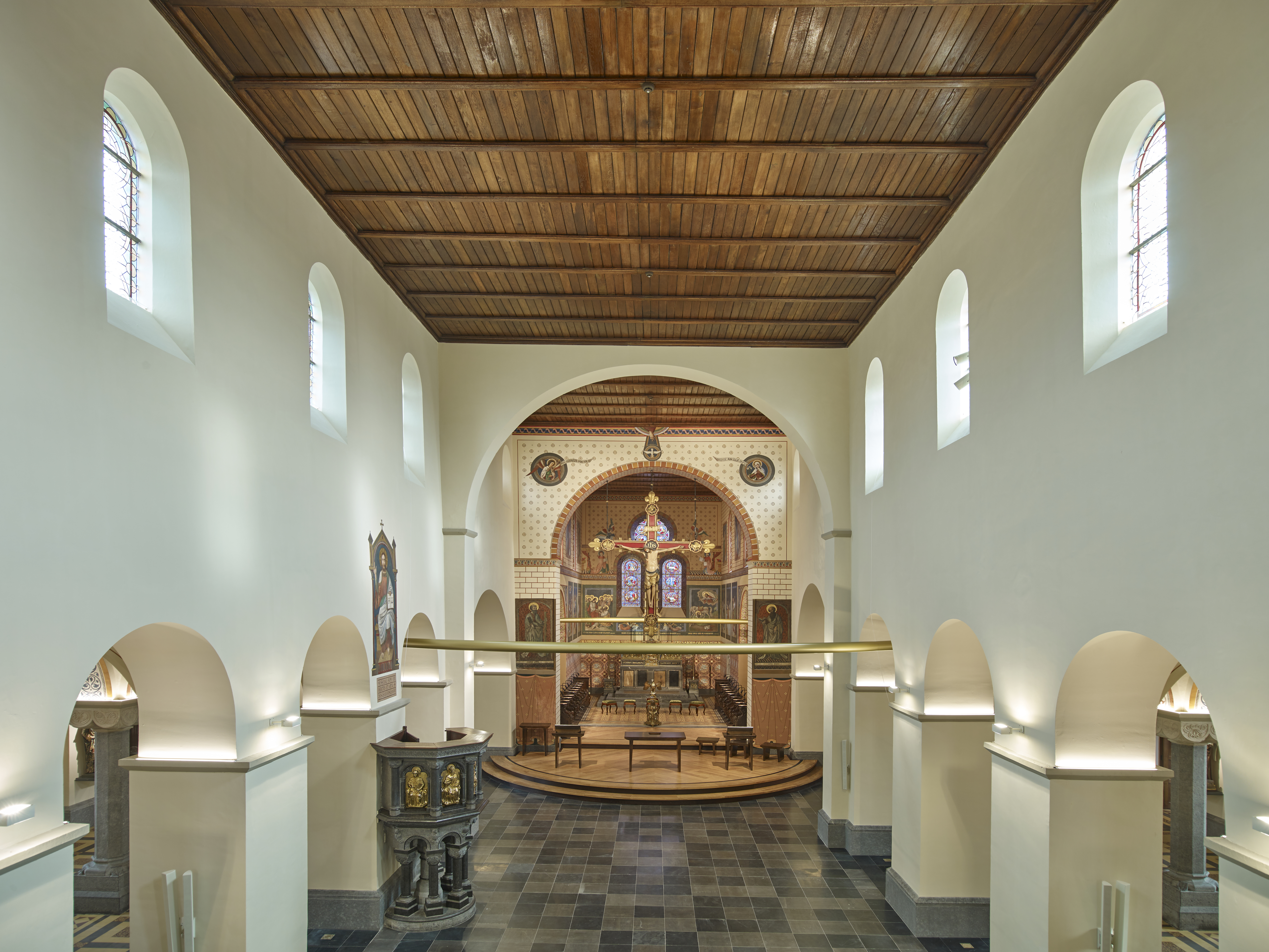 Bij de restauratie van de middenbeuk werd gestreefd naar soberheid. Om het romaans karakter te beklemtonen zijn de pilasters en ruimten enkelvoudig geschilderd en vervangt een nieuwe donkere natuurstenen vloer de cementen tegelvloer van 1900. Enkel de preekstoel en een secco- muurschildering ‘Christus Triomfator : Ego sum via, veritas et vita’ boven de preekstoel doorbreken de monotonie.