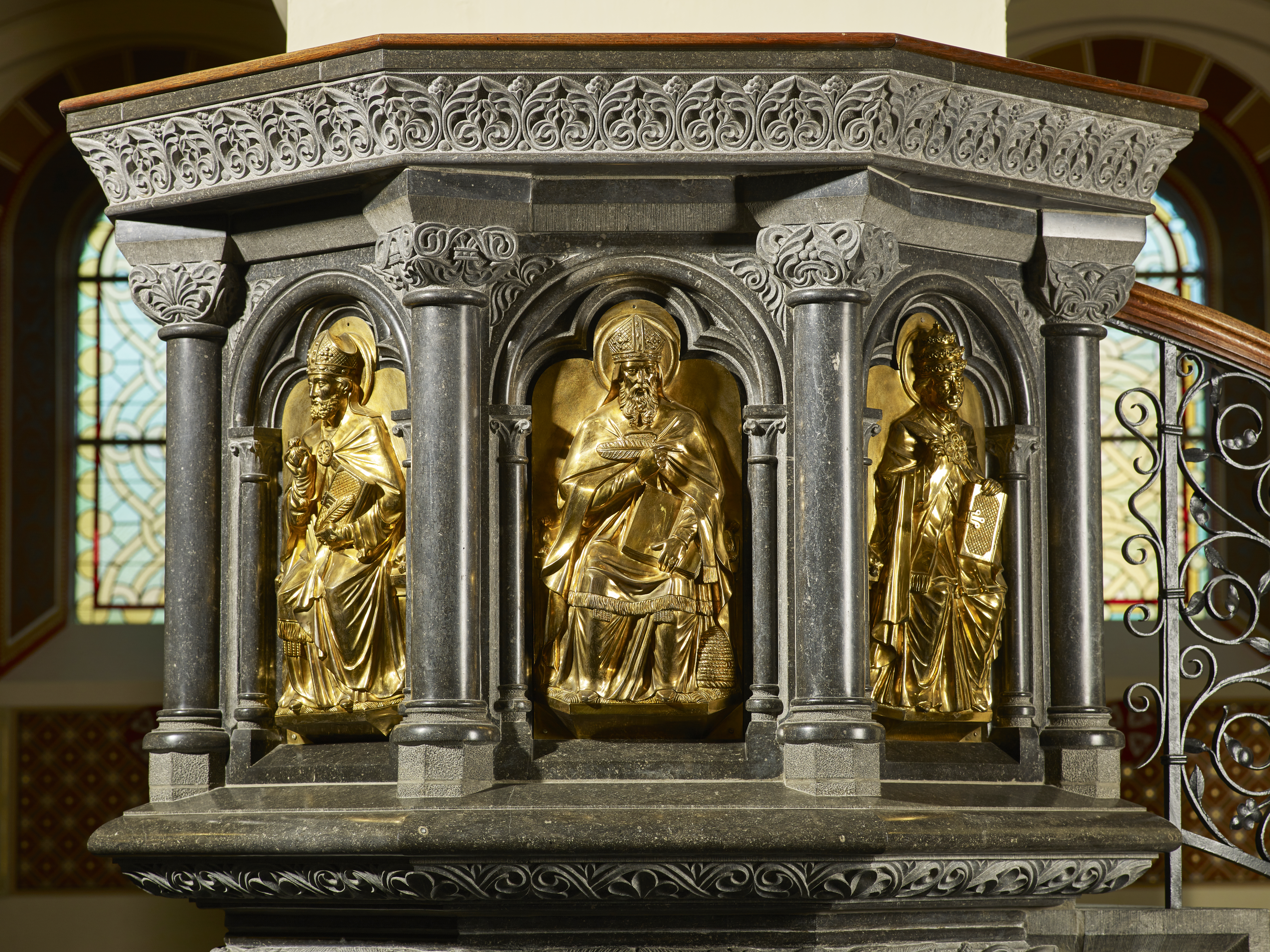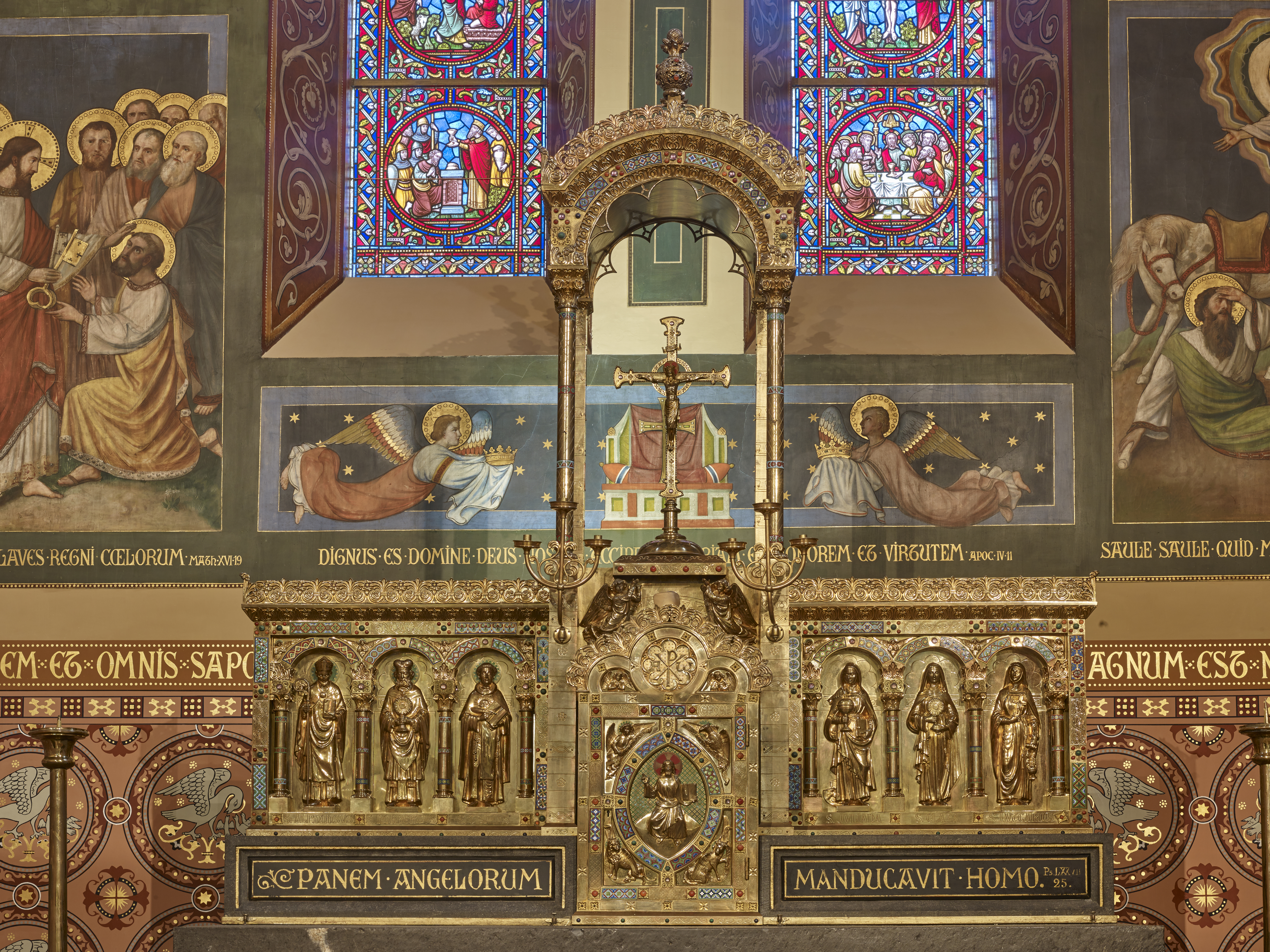 Frontaal staat het hoofdaltaar in verguld koper, versierd met email en edelstenen. Het dateert uit 1908 en werd vervaardigd door Pirlot. Het tabernakel toont een lerende Christusfiguur in een met emailplaatjes versierde mandorla (symbool van de oneindigheid). Dit hoofdaltaar werd voor het Tweede Vaticaans Concilie door de priester gebruikt voor de eucharistie. Hij stond met de rug naar het volk en deed zijn dienst in het Latijn. Na het concilie (1965) werd dit altaar niet vaak meer gebruikt, tenzij voor de uitstalling en aanbidding van het H. Sacrament.