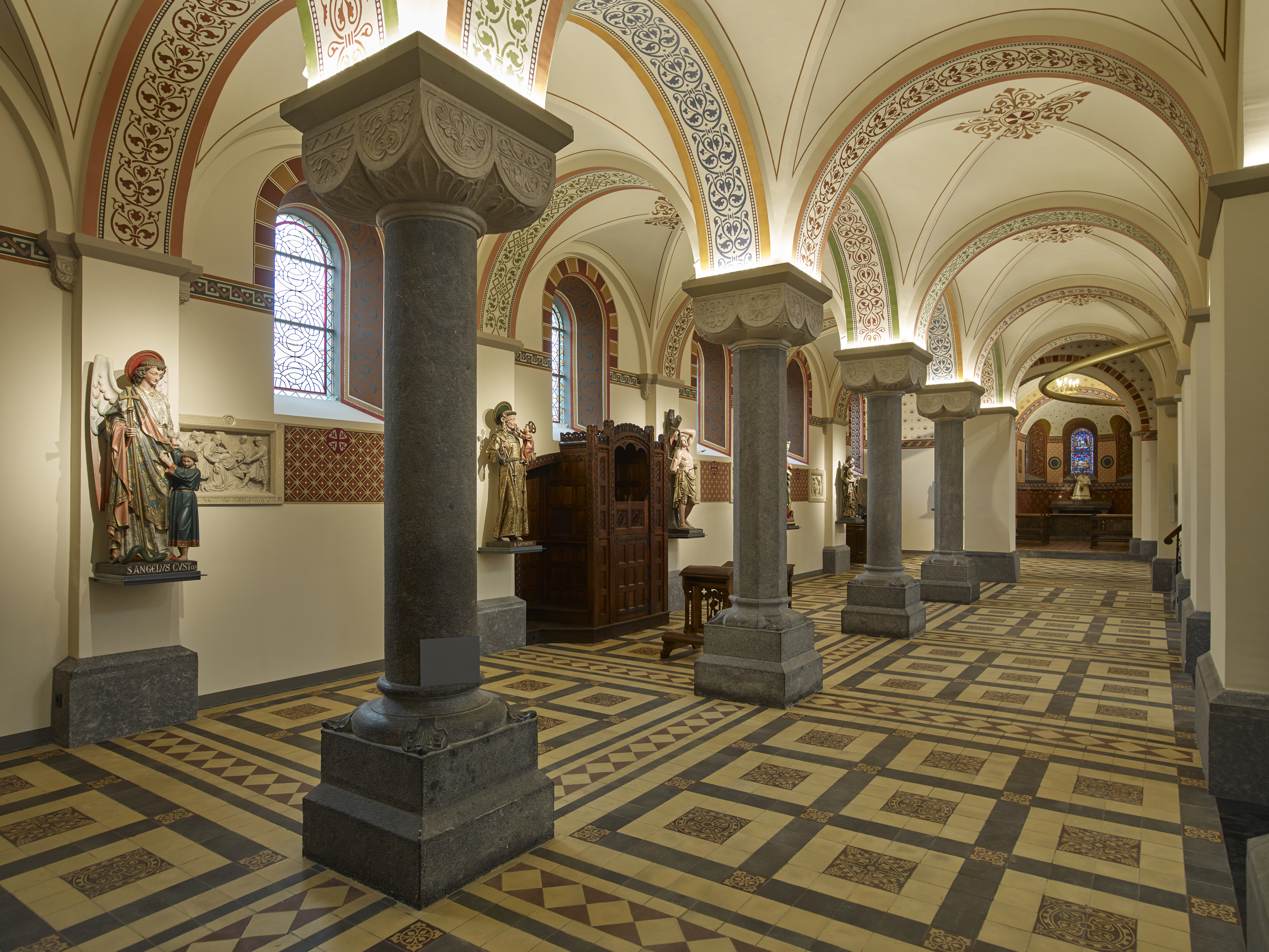 De zijbeuken zijn neoromaans, net als de zijkapellen en het hoogkoor. Zij zijn het resultaat van de laatste grote renovatie, in het begin van de 20ste eeuw (1903-1907), met als bouwheer Deken Peumans. De zijbeuken zijn onderling gescheiden door 5 traveeën, steunend op afwisselend ronde en 8-hoekige zuilen met zware teerlingkapitelen. De zoldering is een kruisgewelf met kruis- en gordelbogen. De relatief kleine ramen beperken de natuurlijke lichtinval. De zijbeuken krijgen hun neoromaans karakter terug door de restauratie van de boog- en plafondbeschilderingen. De kruiswegstaties onderstrepen dit karakter. De dagkanten van de ramen zijn in kleur hersteld en de polychrome 19e eeuwse heiligenbeelden zijn tegen de buitenmuren geplaatst.