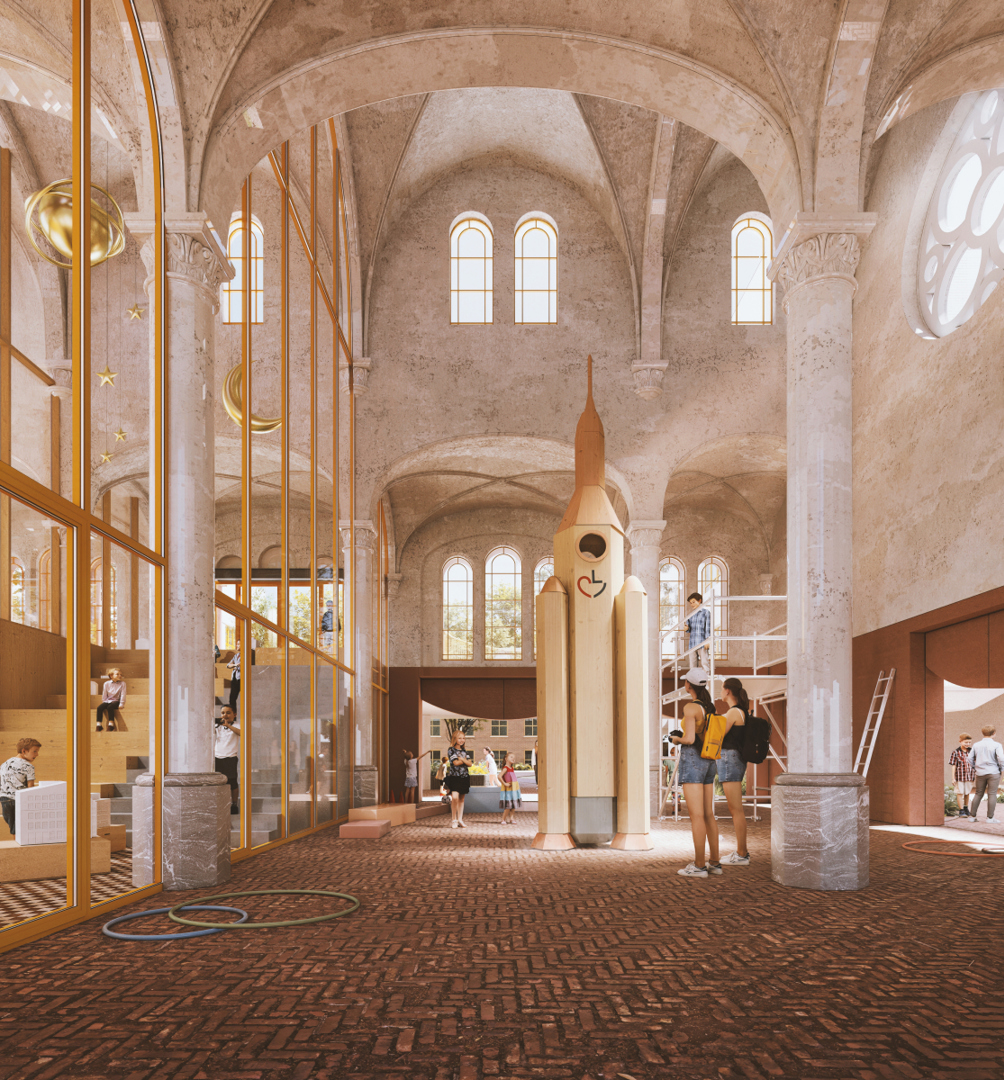 Het ontwerp bouwt verder op wat al aanwezig is en versterkt de samenhang van de site. Bestaande gebouwen blijven behouden, een voormalige kapel krijgt een nieuwe invulling en nieuwe voorzieningen voor kleuter- en lager onderwijs vervolledigen het programma. Die ingrepen worden niet als losse toevoegingen opgevat, maar als een gelaagde en coherente voortzetting van het geheel, met aandacht voor schaal, zichtlijnen en ruimtelijke continuïteit.