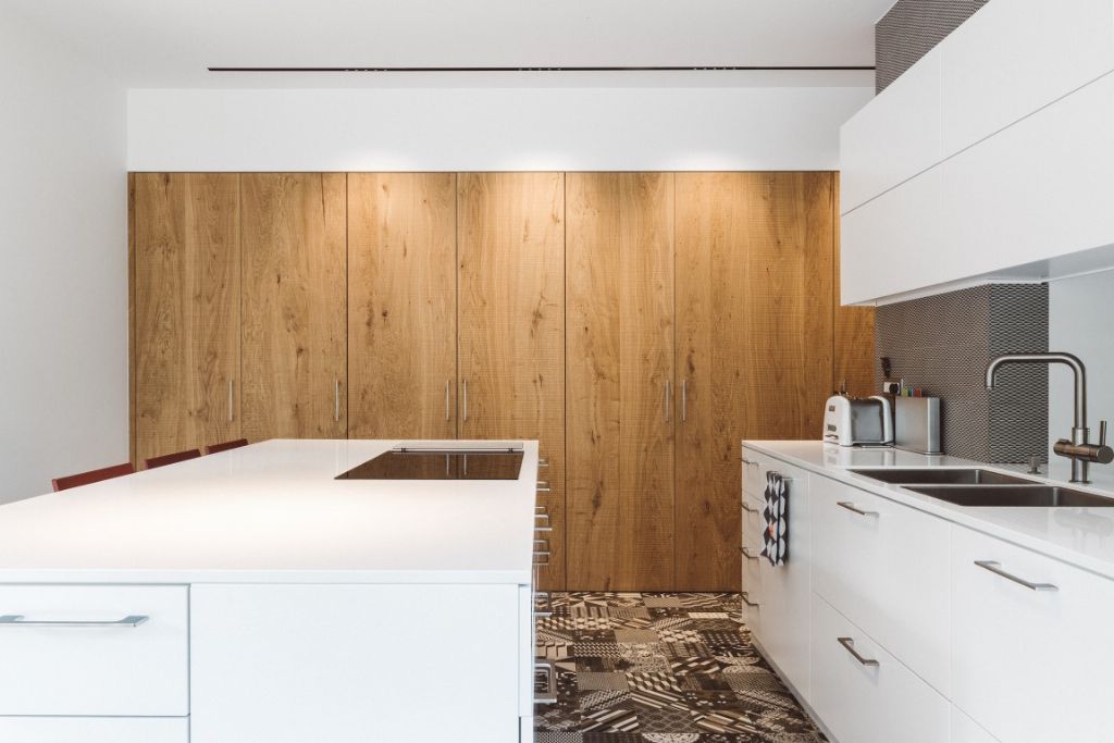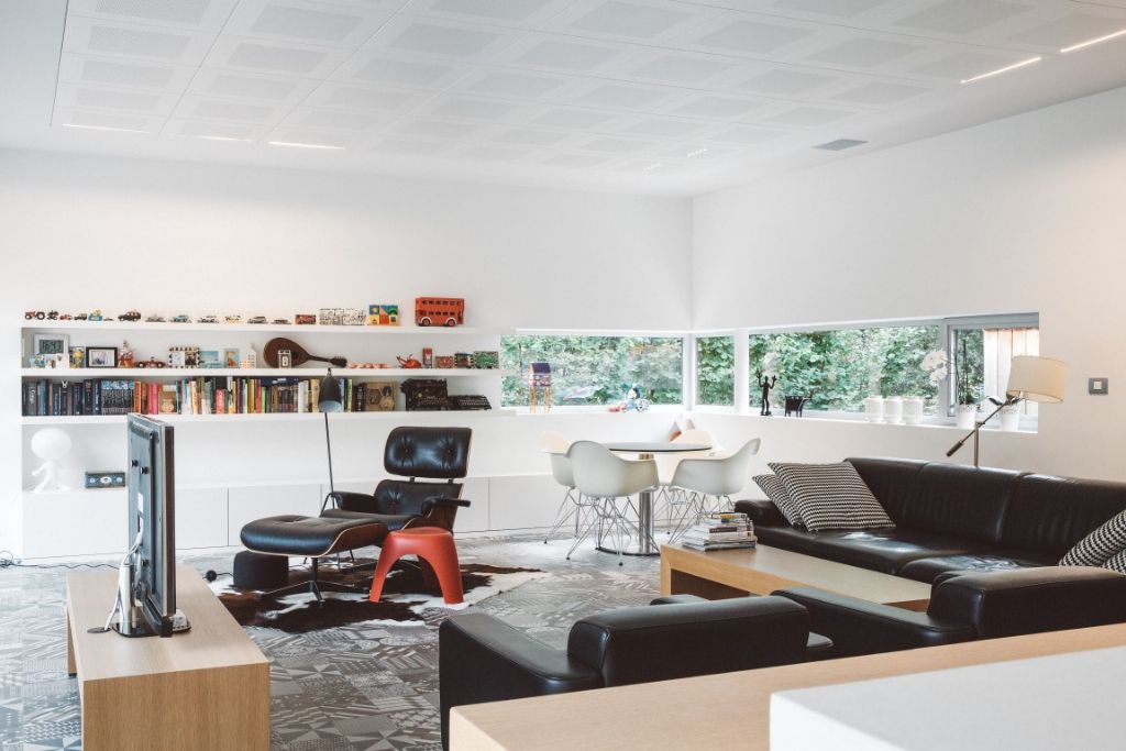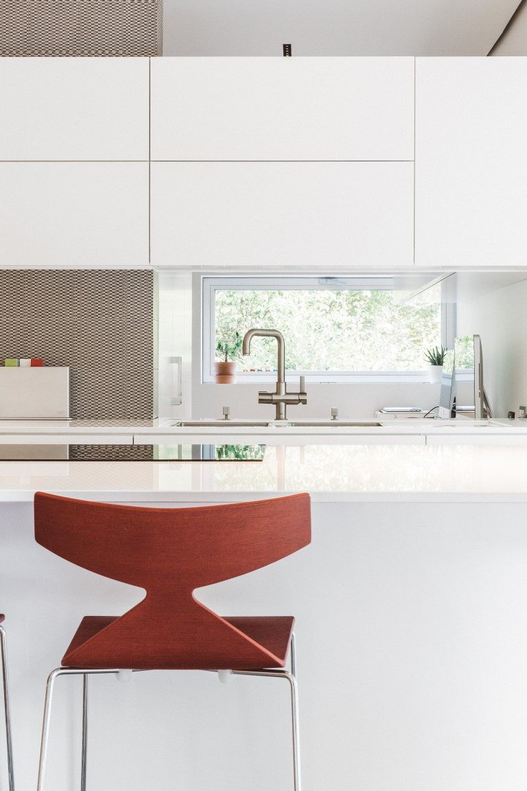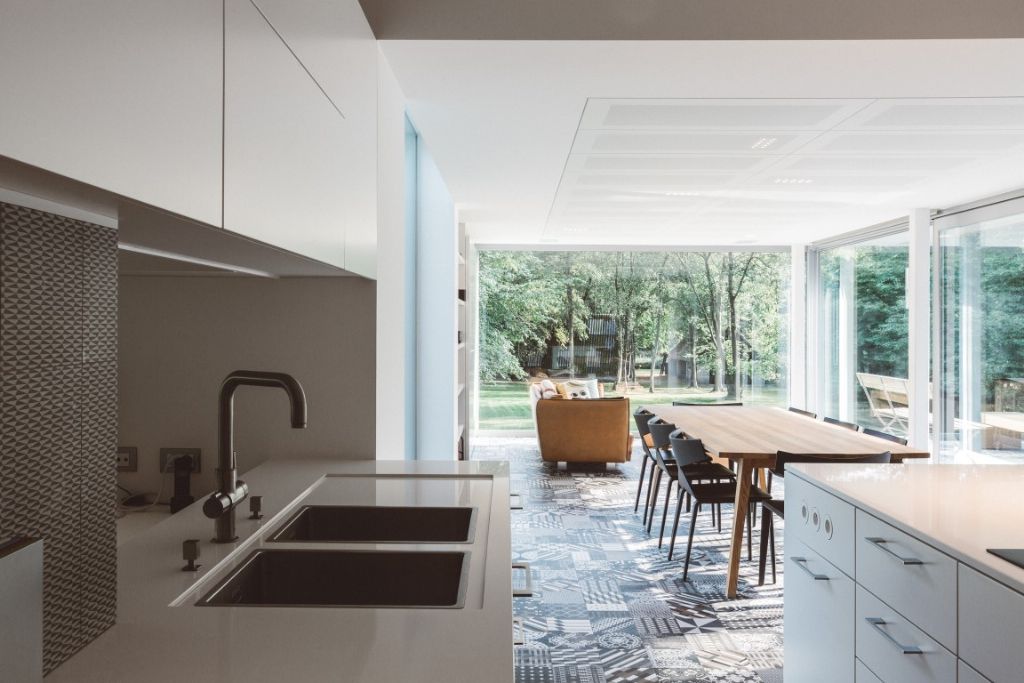 Enkele jaren geleden hebben we de woning uitgebreid met een grote woonkeuken aan de tuinzijde. De balkvorm kreeg daarmee een L-vormig grondvlak, waarbij ook de keuken aansluiting vond met het terras. Die uitbreiding lijkt het leven in huis naar zich toe gezogen te hebben. Het is de ideale plek voor alle gezinsleden om elkaar te ontmoeten, samen te eten en bij te praten, niet gehinderd door een televisietoestel, computer of andere storende elementen.