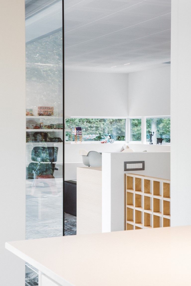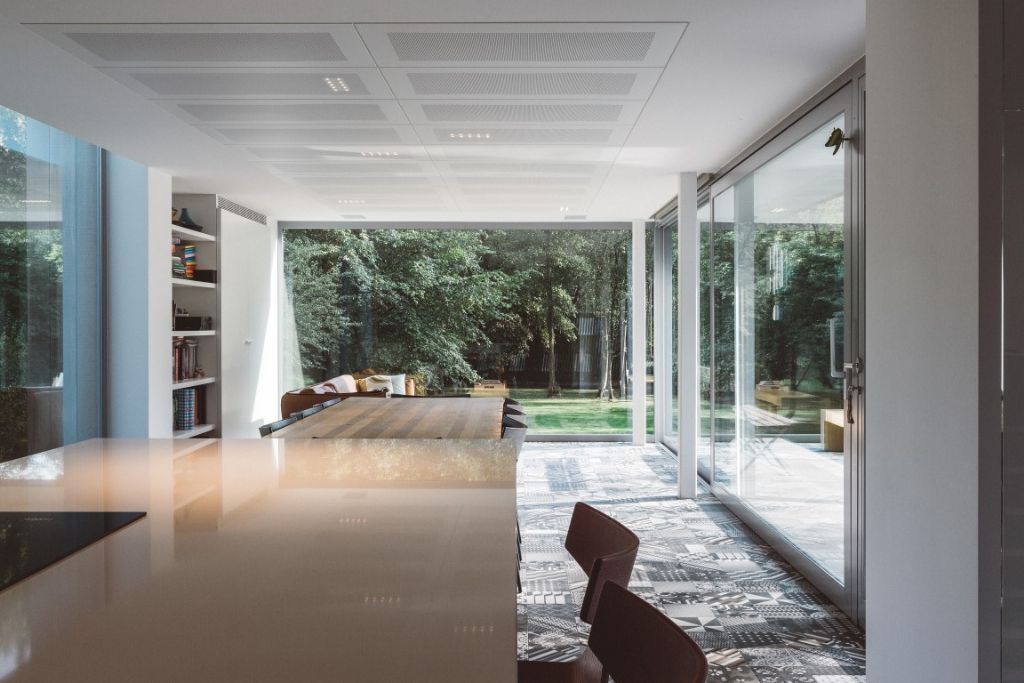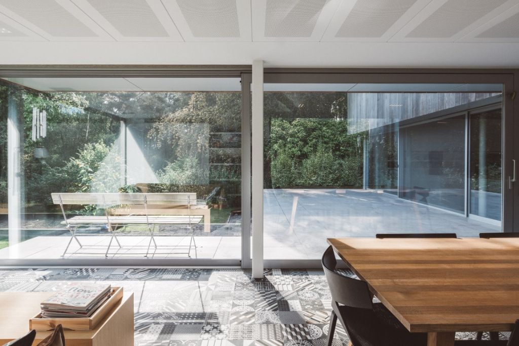 Genieten van de steeds wisselende groene omgeving is voor ons even belangrijk als het interieur. We hebben deze unieke plek dan ook zoveel mogelijk in haar oorspronkelijke vorm gelaten: de tuin is enkel aangelegd in de onmiddellijke nabijheid van de woning. De half ondergrondse slaapruimtes zijn volledig georiënteerd naar en verbonden met de tuinzijde. In het dakvolume kreeg de multifunctionele ruimte een panoramisch raam. De leefruimtes op het tussenvolume zijn verbonden met de buitenruimte door een terras op hoogte. Het contact met buiten ervaren we als onmisbaar.