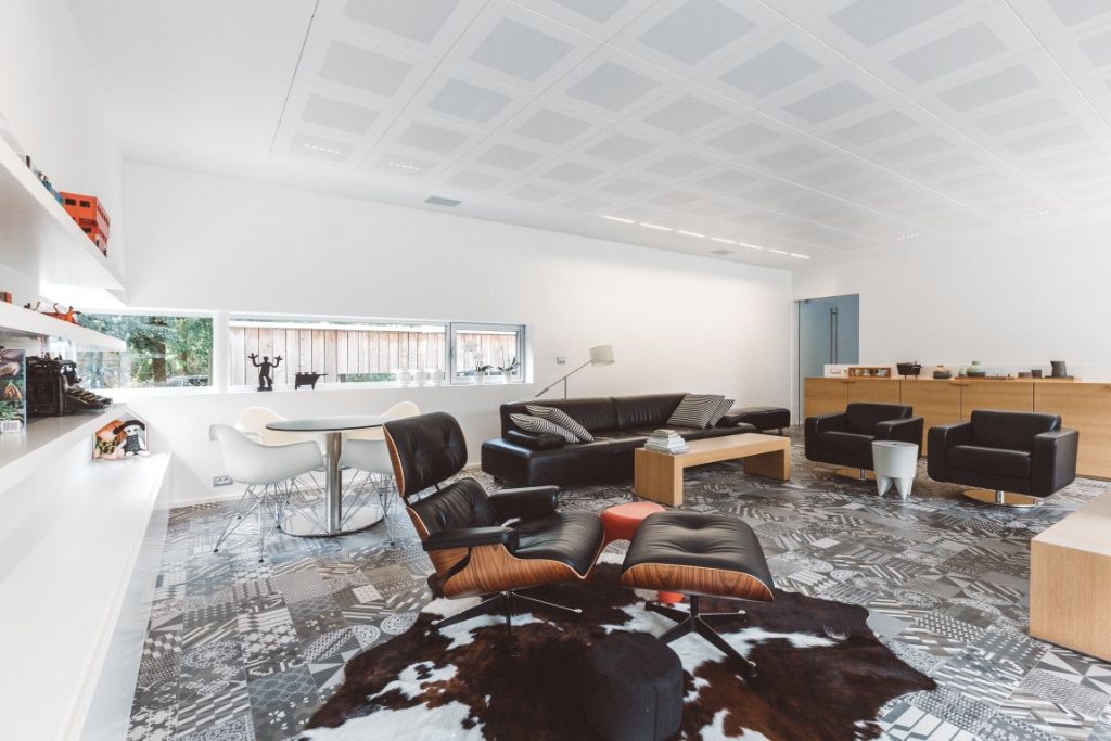 De vloer in de woonkeuken trokken we meteen door naar de andere leefruimte. Tijdens een bezoek aan de Mutinafabrieken werden we getroffen door dit design van keramische tegels, dat dynamiek en harmonie verenigt. Het is een opvallende verschijning maar past binnen de sobere inrichting, waarin eikenhout de grotendeels zwart-witte inrichting vervolledigt. Designklassiekers worden hier aangevuld met herinneringen aan vakanties en andere belangrijke familiemomenten. De woonkamer is voor ‘s avonds, overdag vind je ons vooral in de nieuwe keuken.