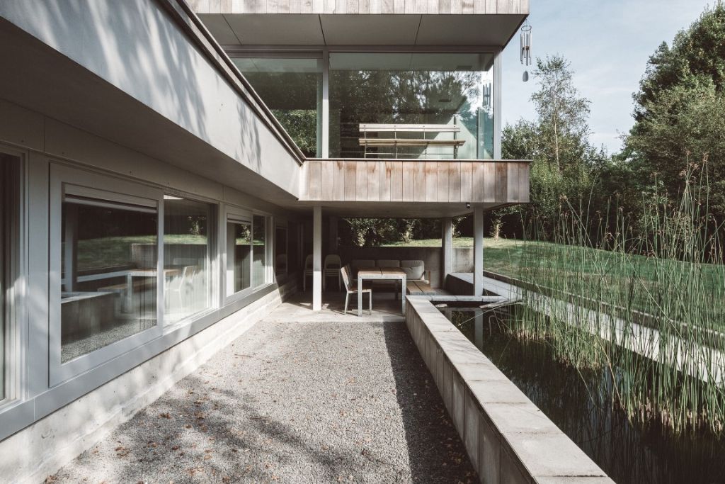 De helling in het terrein liet ons toe om de nachtzone half ondergronds onder te brengen. De slaapkamers genieten zo van direct contact met de tuin en de omgeving, en blijven ook op warme dagen heerlijk koel doordat de betonnen sokkel waarin ze ingebed liggen de warmte opneemt. Het geheel is constructief en technisch zo opgevat dat we van het half ondergrondse niveau met enkele wijzigingen een aparte woonentiteit kunnen maken, met een rechtstreekse toegang naar buiten, een eigen terras en een eigen badkamer. Maar aan kangoeroewonen zijn we nog niet toe. Het onderhoud van onze grote parktuin brengt de nodige fysieke inspanning met zich mee en zo huldigen we dankzij onze woonomgeving het principe van mens sana in corpore sano.